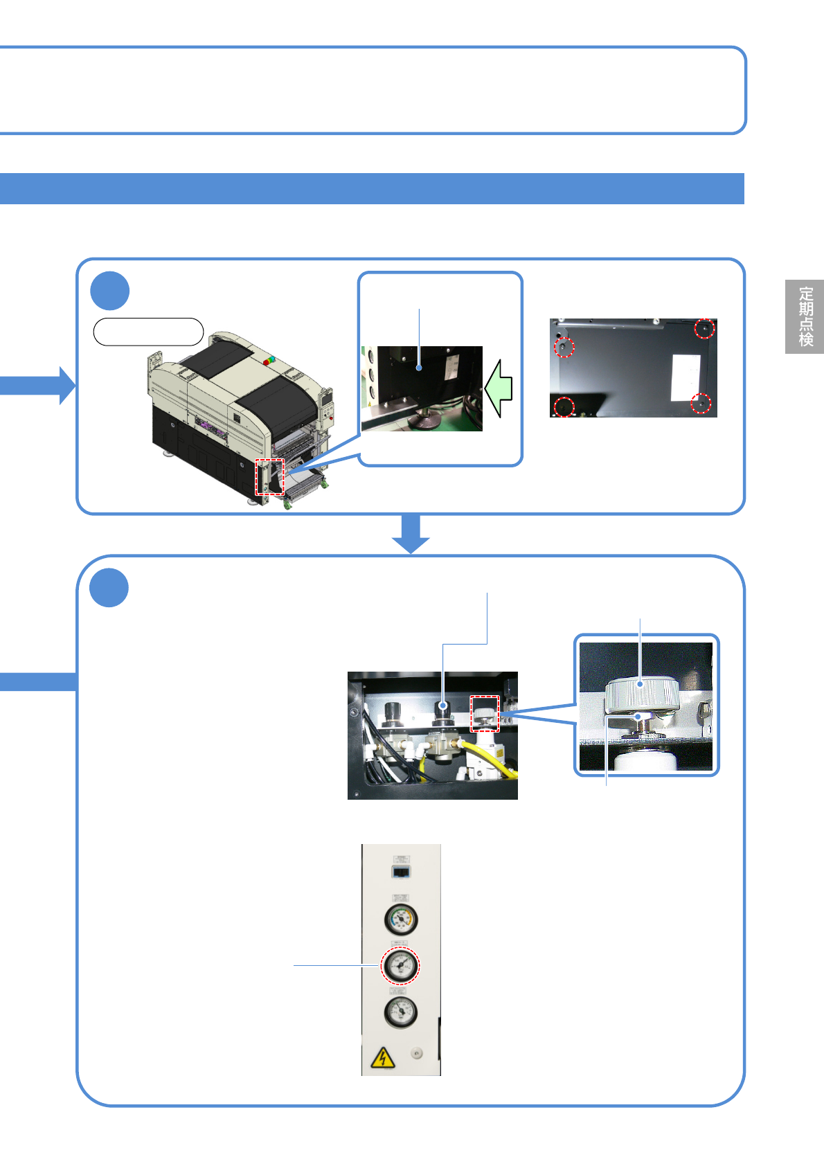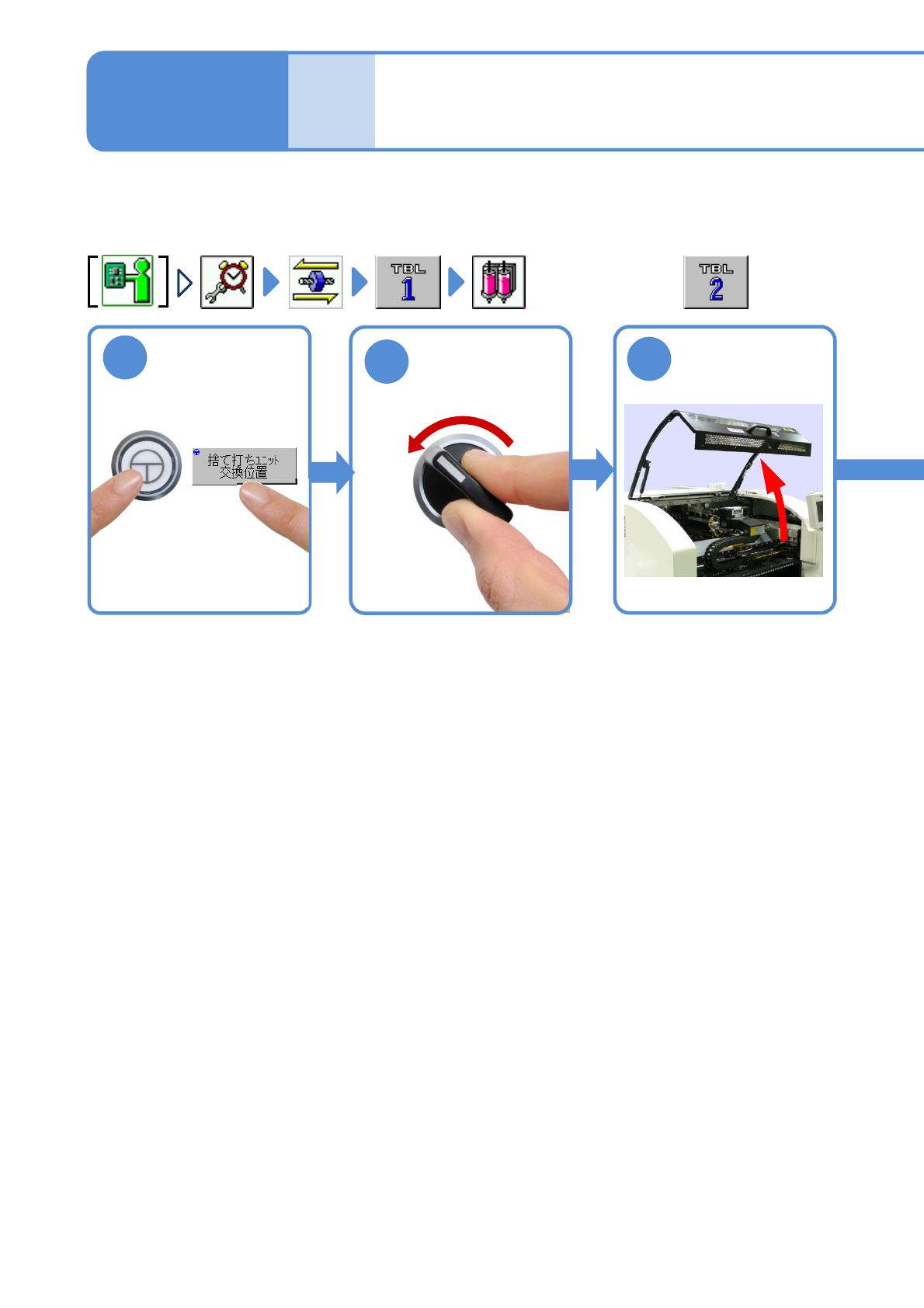 NPM-W 2 EJM7DJ-MB-04M-00 始業前 4-1-2 -1 捨て打ちテープの点検 ( 塗布ヘッド ( オプション )) メンテナンス 編 4-1-2 使用工具:不要 所要時間: 1 分 (1 か所当り ) 捨て打ちテープの点検について説明します。 ●後側のときは、 1 ●ヘッドが交換位置に移動 する。 OFF SERVO 2 3