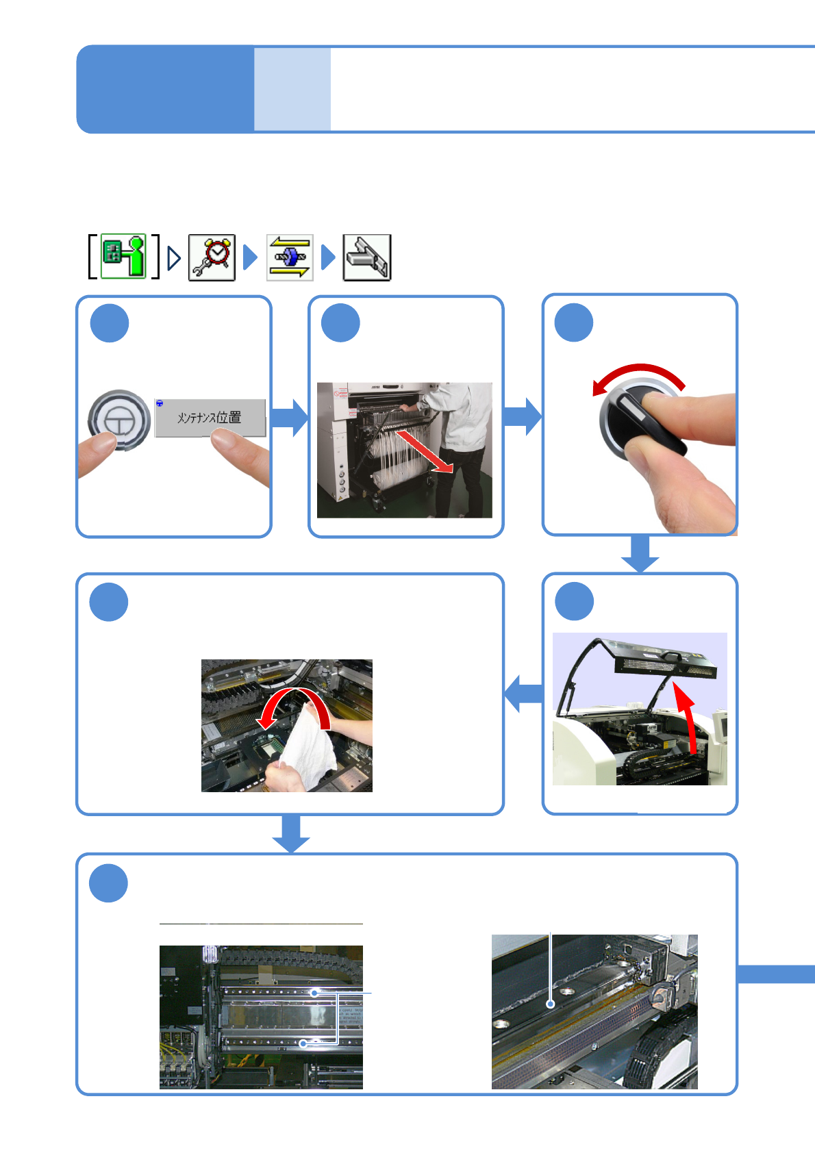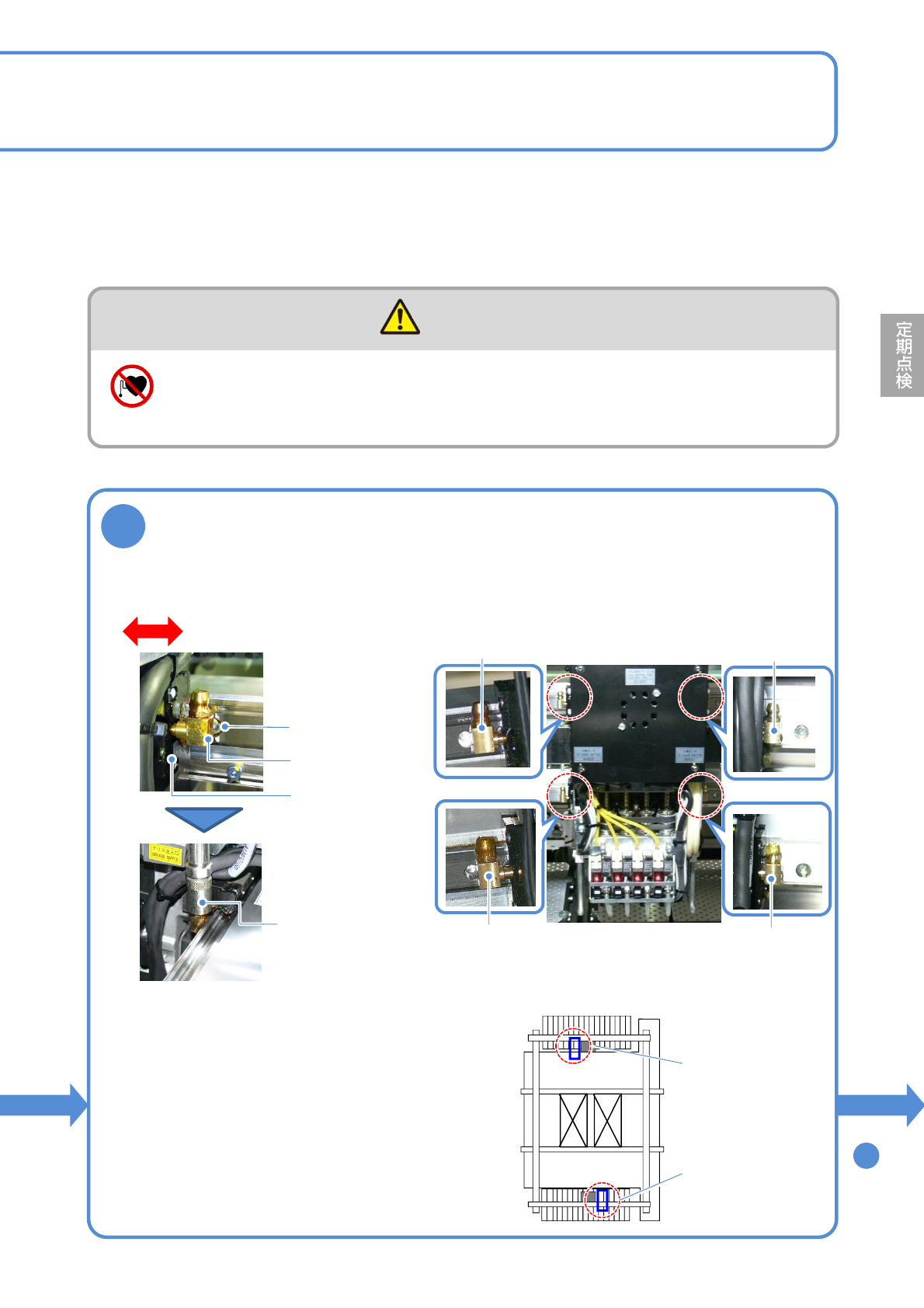 NPM-W 2 EJM7DJ-MB-06M-00 6-2 -2 5 6 0 時 間 メ ン テ ナ ン ス 警告 心臓ペースメーカーなどを使用している人は、リニアモーター部に近づかない ( 磁力による誤作動で、事故のおそれ ) ●グリースニップル 位置 上下 4 か所 ●グリースニップル 位置 上下 4 か所 X軸リニアガイドに給脂する ●上下 4 か所のグリースニップルに、下記の 手順で給脂 する。 ① 1/4 ポンピングを行う。 (…