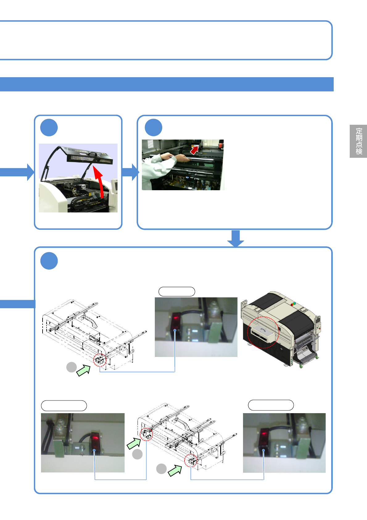 NPM-W 2 EJM7DJ-MB-06M-00 6-9 -4 5 6 0 時 間 メ ン テ ナ ン ス ( 反射タイプ ) 基板検出センサー A 矢視図 A 6 基板検出センサー部を清掃する ■シングルコンベヤー前工程に設置されたときの、センサーの 位置 ●綿棒を使用する。 ( 反射タイプ ) 基板検出センサー A 矢視図 A ■デュアルコンベヤー前工程に設置されたときの、センサーの 位置 矢視図 B B ( 反射タイプ ) 基板検…