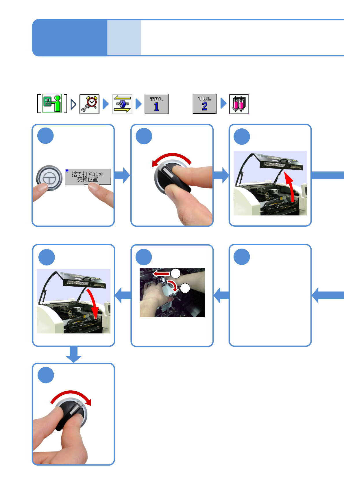 NPM-W 2 EJM7DJ-MB-06M-00 6-19 -4 5 6 0 時 間 メ ン テ ナ ン ス 13 15 14 ENABLING Z1 軸を選ぶ ●給脂したグリースをなじ ませるため、を 5 往復以上 連続動作させる。 連続動作を停止 する 交換台車を取り 付ける ( → P.3-2) 12 STOP SERVO ON 23 22 SERVO ON 11 10
