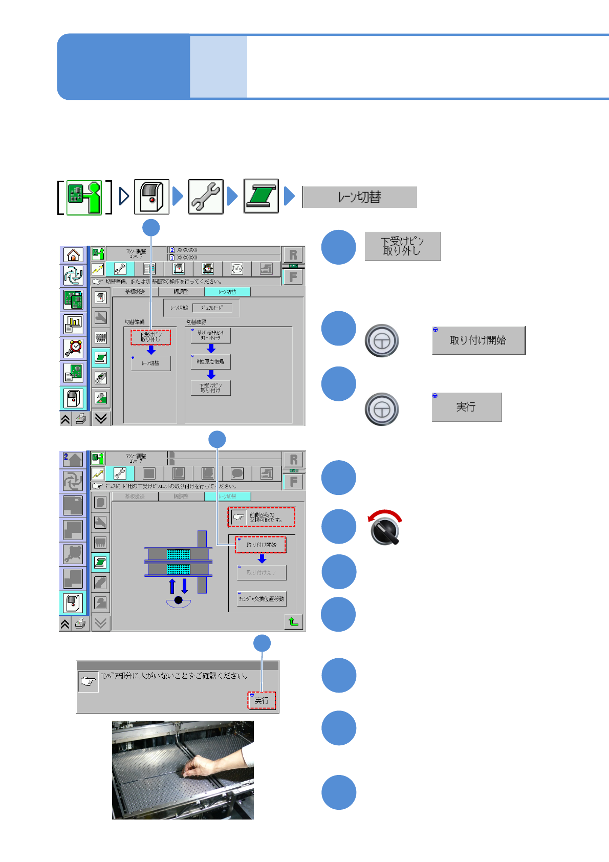 NPM-W 2 EJM7DJ-MB-11M-00 モードの 切り替え 1 1-3-1 -1 シングルレーンモードへの 切り替え 設備がデュアルコンベヤー仕様のとき、モードを切 り替えることで、シングルコンベ ヤーとしても、デュ アルコンベヤーとしても使えます。 ●下記の手順で切り替えてください。ここでは、デ ュアルレーンモードからシングル レーンモードへの切 り替えを説明します。シングルレーンモードからデ ュアルレーンモードへの切り替え…