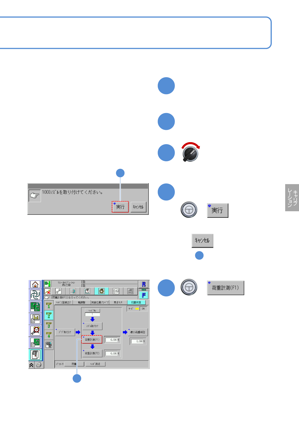 NPM-W 2 EJM7DJ-MB-13M-00 サーボスイッチ ON 13-8-1 -4 17 ノズルを取り付ける 18 安全カバーを閉じる ●測定するノズルポジションに取り付 ける。 (1003 ノズル使用 ) 19 ( キャリブレーションが開始される ) ●測定中の安定した数値を読み取る。 荷重計測値の表示については、ノズル とジグが接触するときに一瞬数値が大 きくなり、正確な測定値が読み取れな いため、最大表示にせずに標準値で測…