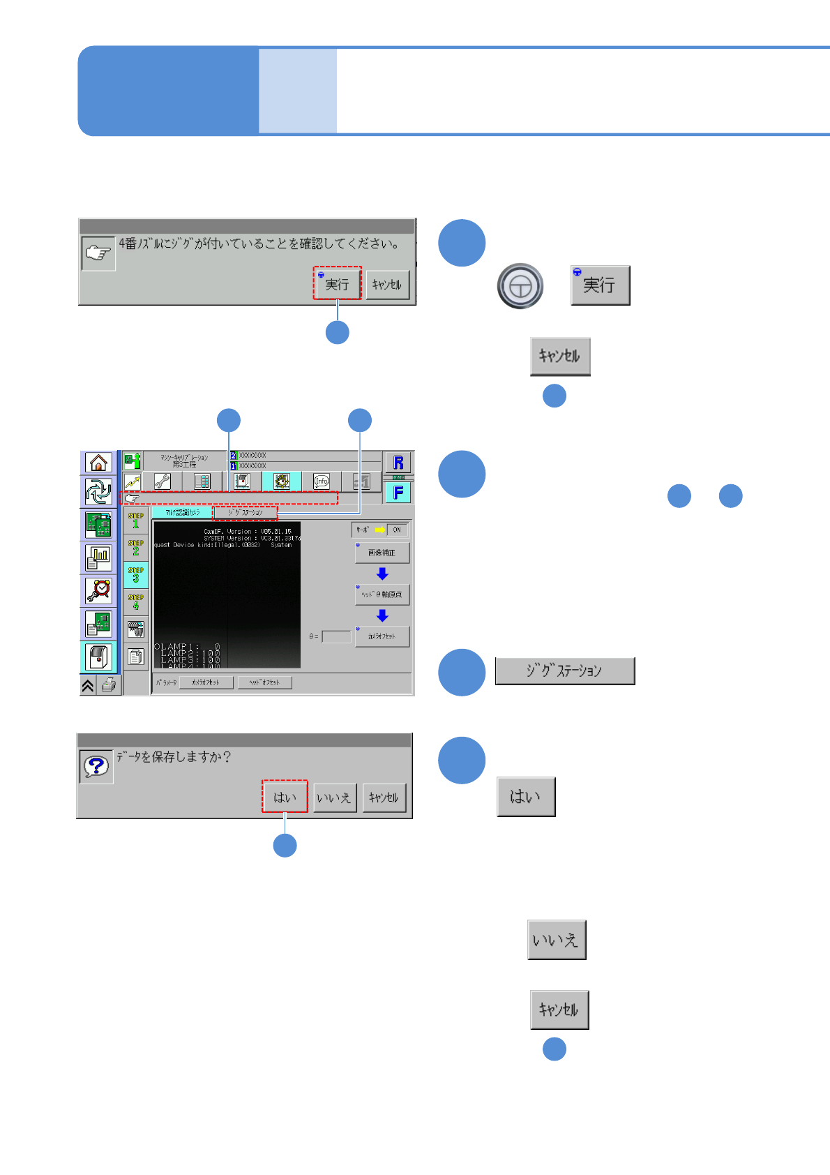 NPM-W 2 EJM7DJ-MB-13M-00 13-9 -6 30 正常に終了したことを確認して + 30 ( キャリブレーションが開始される ) 31 マルチ認識カメラジグを確認する 準備をする。 32 サーボスイッチ OFF 33 安全カバーを開く マルチ認識カメラジグが取り付け られていることを確認する 34 ●使用するノズル ヘッド タイプ ノズル ポジション 16 5 番 12 4 番 8 3 番 3 2 番 35 36 …