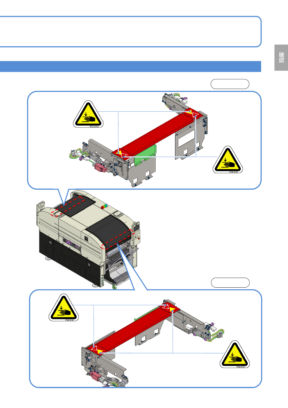 NPM-W 2 EJM7DJ-SF-01N-00 1-2 1-2 -17 警告のラベル ■安全カバー 警告表示ラベル 9 前側 安全カバー 後側 ●塗布ヘッド仕様 ●検査ヘッド仕様 ●ヘッド無し仕様 ●塗布ヘッド仕様 ●ヘッド無し仕様
