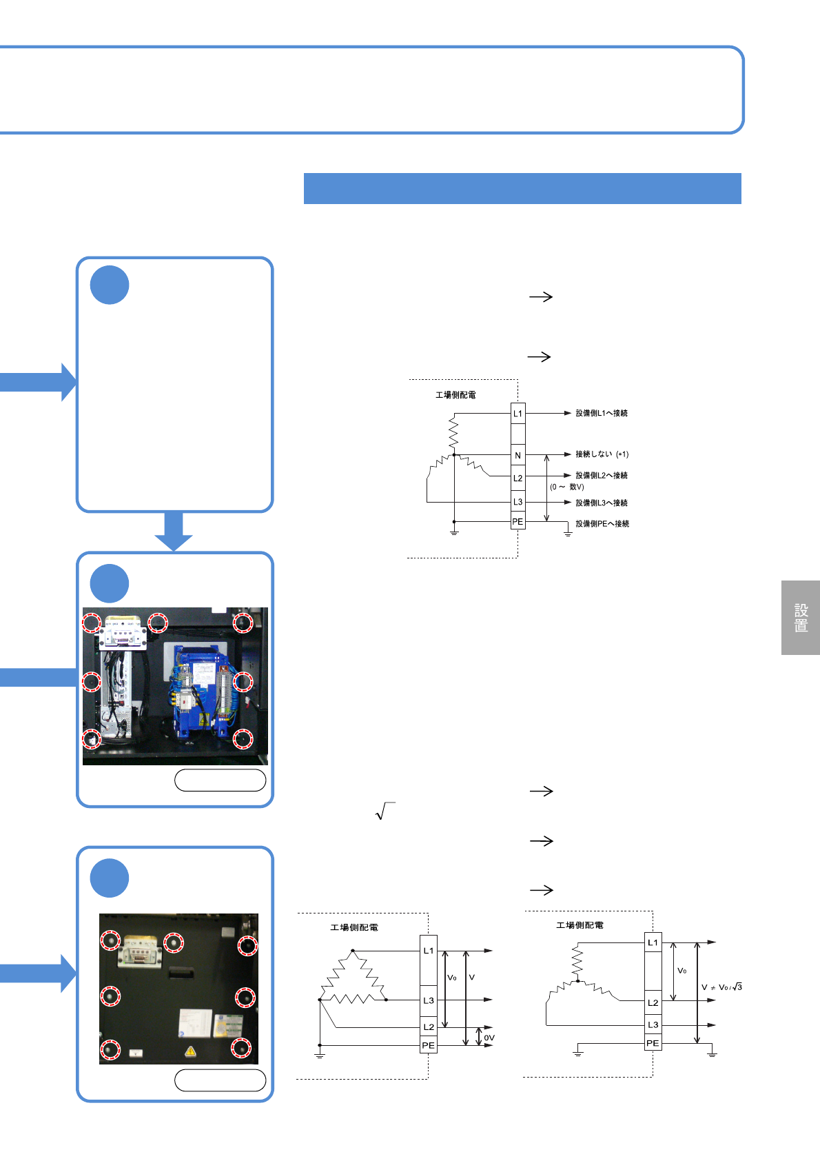 NPM-W 2 EJM7DJ-MB-14M-00 主電源 の接続 1次側と設備側の 電圧の調整 14-4-3 -1 1 1 次電源の電圧を切り替える ( トランスの 1 次電源電圧は、下記の電圧に変更 が可能 ) ●供給電源電圧に合わせる。 使用工具:六角レンチ (4 mm) 、付属の専用ドライバー ● AC 290 V 以上 (AC 380 V 以上のタップ ) で 使用すると きは、アースと各相間が AC 290 V 以下であり、供…