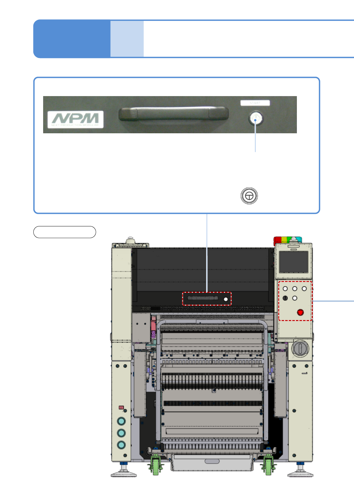NPM-W 2 EJM7DJ-SF-01N-00 1-9-2 -2 非常停止状態 解除状態 SELECT 前側または後側の操作スイッ チ、およびタッチパネルの操 作を有効にする。 ●有効であるときに点灯する。 ENABLING スイッチを押したまま、設備 を動作させるためのスイッチ やタッチパネルの操作ボタン を押す。 ( 危険防止のため ) STOP 生産の一時停止 ( シングルス トップ ) や動作が伴う操作を停 止する 。 非常停…