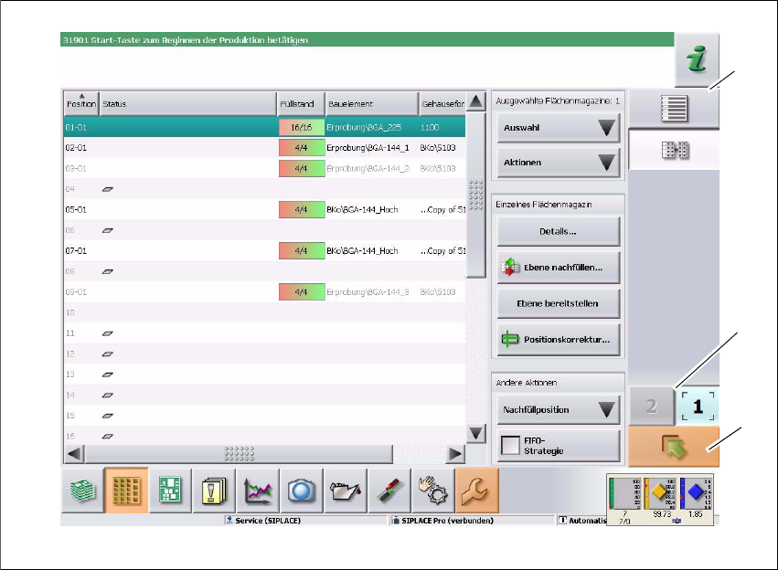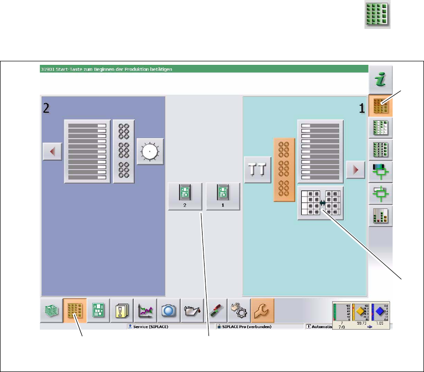 Betriebsanleitung SIPLACE SX4/DX4 5 Aufgaben an der Maschine Ab Softwareversion SR.706.xx Ausgabe 06/2012 DE 5.5 Die Bedienoberfläche 251 Beispiel: Ansicht "Zufü hrmodul, Bauelemente und Pip etten" Klicken Si…