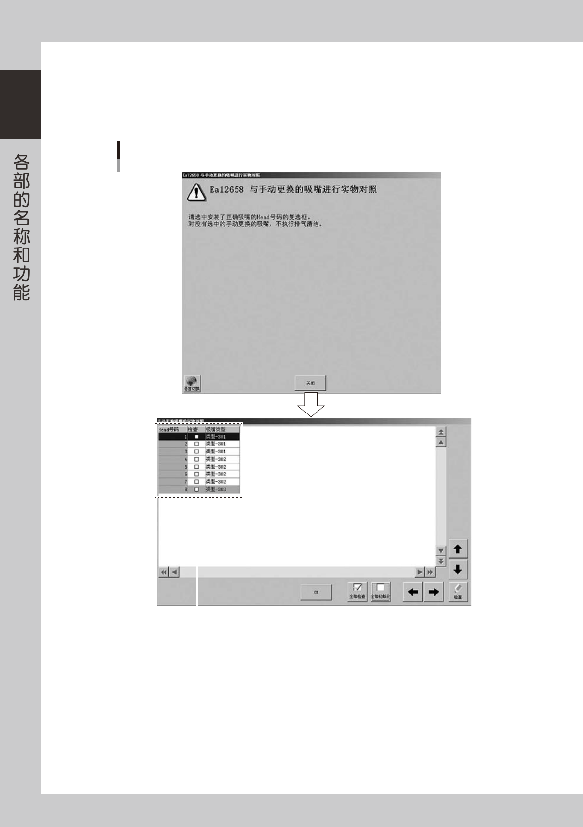 按「与手动更换的吸嘴进行实物对照」对话框的 [ 关闭 ] 按钮,显示「与手动更换的吸嘴进行实物对照」