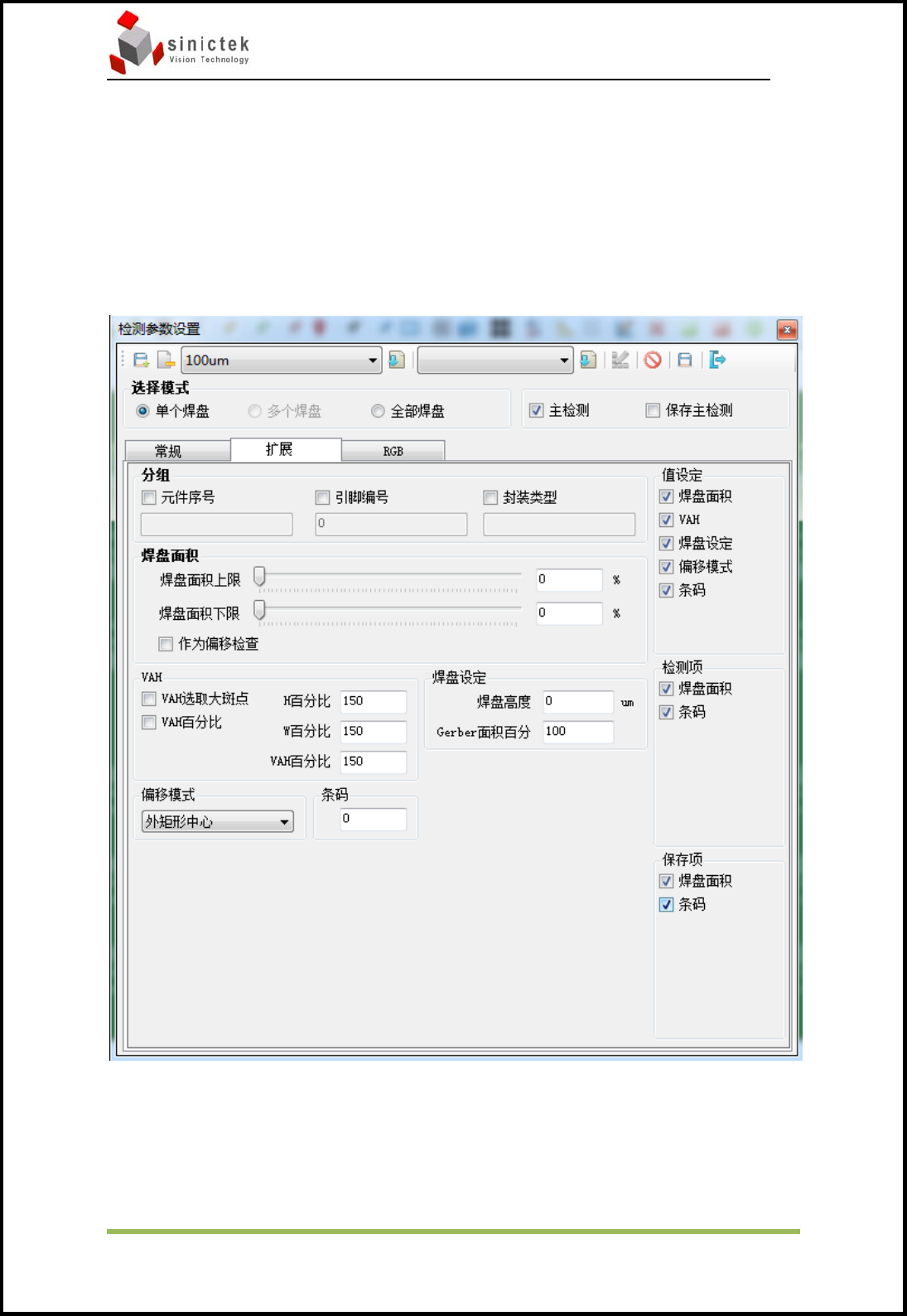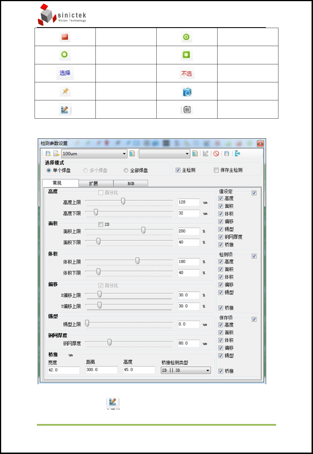 3D ‐ SPI 操作手册 思泰克光电科技有限公司 41 / 82 Copyrigh t by Sinic ‐ Te k Vi s i o n Te c h n o l o g y Co., Ltd. 选中右侧值设定中的项目左侧对应的变为可修改, 然后可…