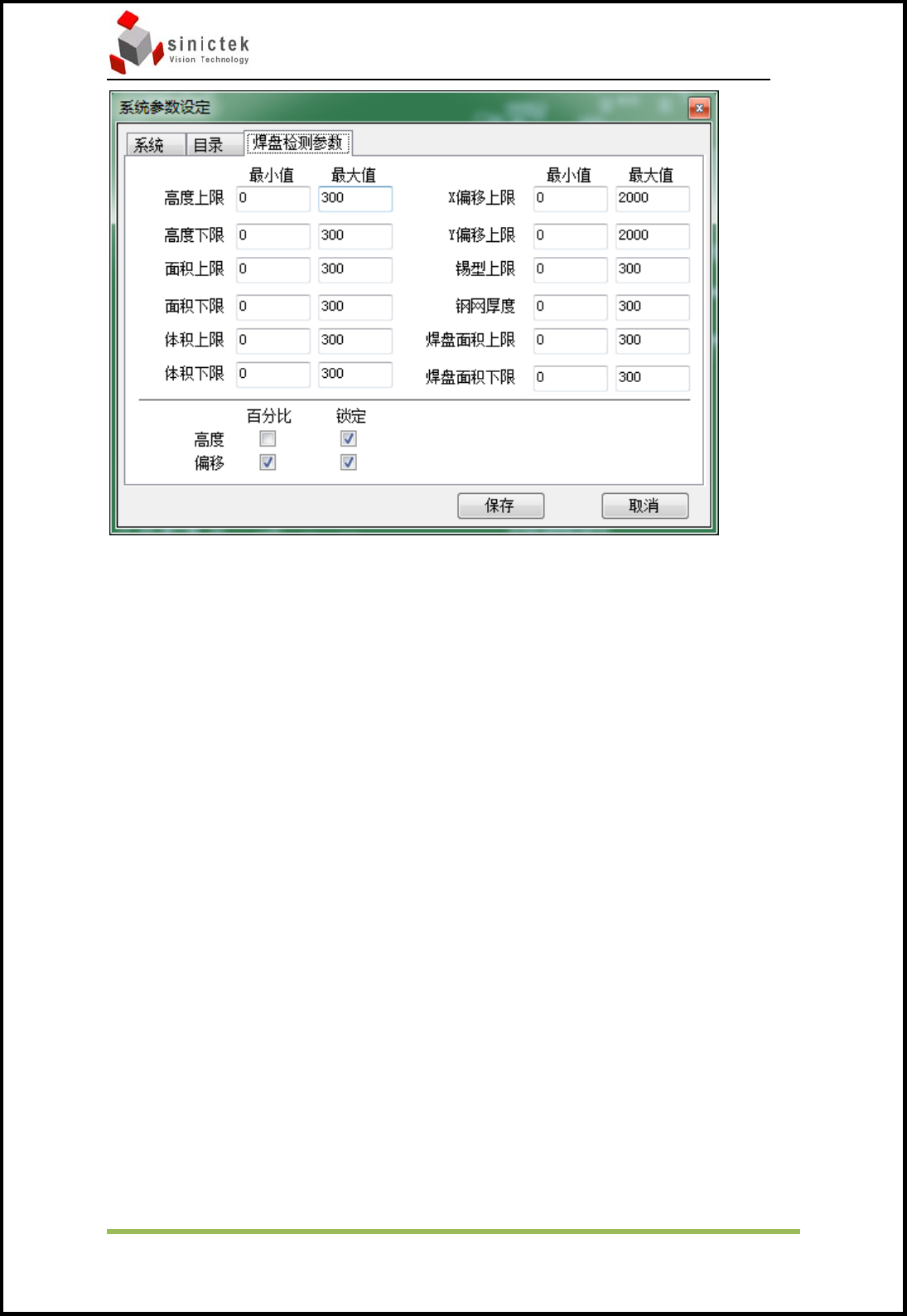 对各个检测项目的参数进行最大值最小值的设定,以及锁定偏移使用百分比单