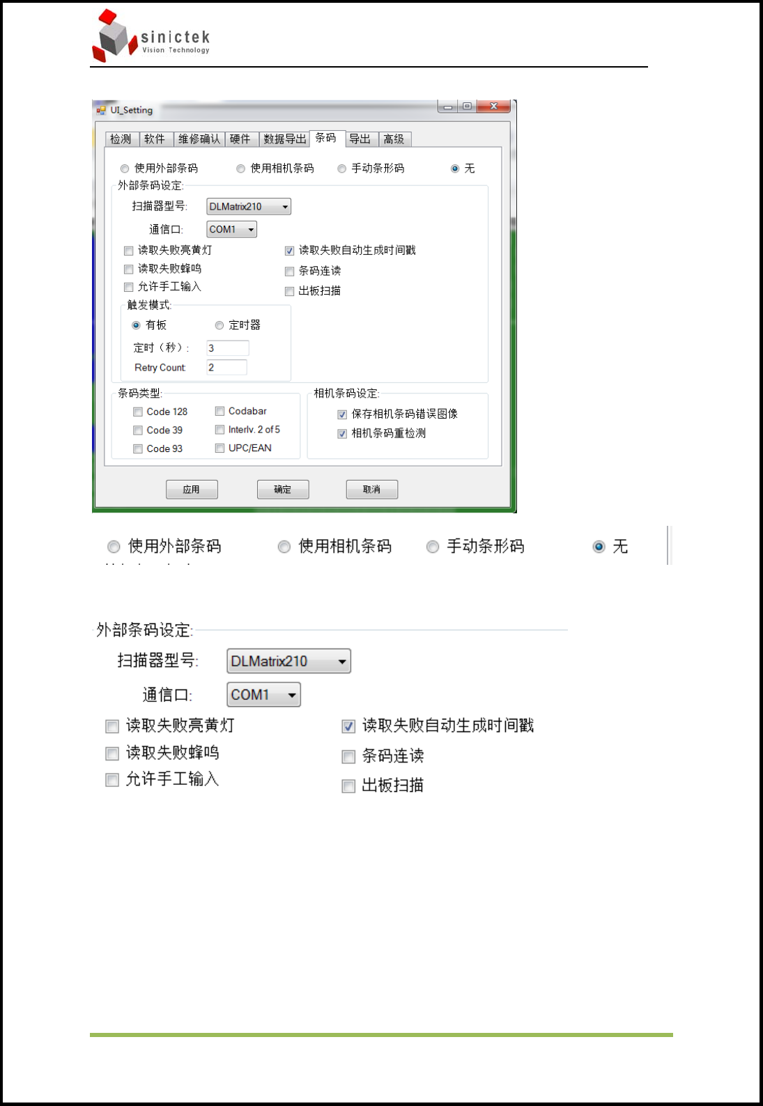 外部条码设定:选择外接式条码枪的型号,目前支持 Datalogic 的 Matrix210