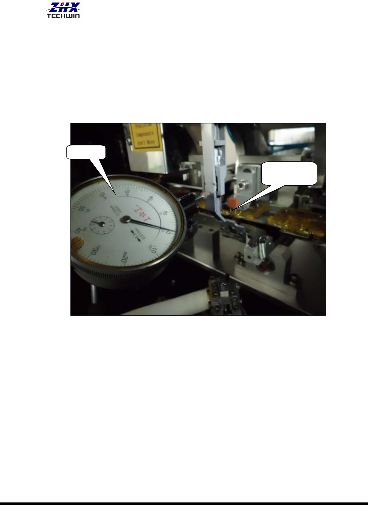 ZHX-R20B/-IN 自动上下板立式插件机操作说明书 深圳市中禾旭精密机械有限公司 www.zhxai.com - 70 - 2)CTA 到插件头行程调整。 (1)打开操作界面的“诊断”选项。 (2) 选择引脚直径在 0.36mm-0.5mm 之间的元件, 并将元件卡在弯形三叉推料器前面的那个 链夹上。 (3)将千分表的表头与插件头主爪的背面相接触,并轻轻的施加压力给表头,使表的读数 在 0.25mm-0.8mm 范围内变化,再将表…
