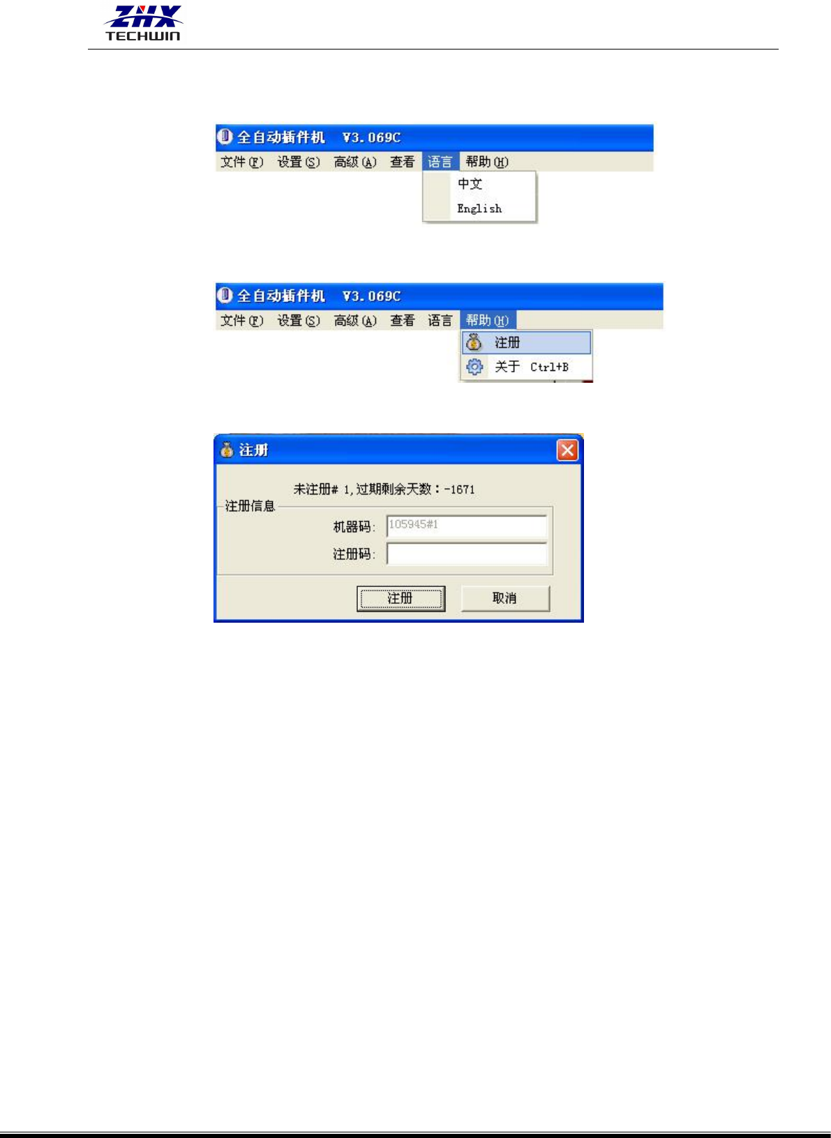 注册:自动插件机到期系统会提示注册信息,(如有快过期的设备,请把机器码记入与中禾