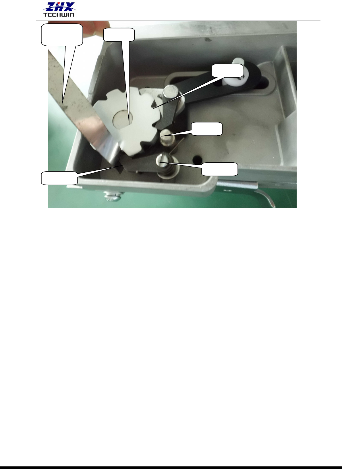(4)把一个厚度为 0.05mm 的塞尺放入棘爪 2 的端面与棘轮间。