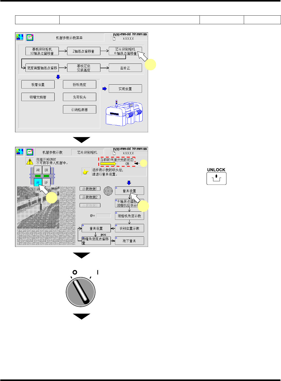 CM602-L 维修手册 2.2 机器参数的示教步 骤 Pa ge 2- 73 多功能吸头 使用工具 吸嘴量具 (N6100 04070 AA) 需要时间 10 分钟 1. 按 [ 芯片识别照相机 θ 轴原点偏移量 ] 。 2. 选择要进行示教的工作台。 3. 按操作面板的 + [ 量具设置 ] 。 • 吸头移动到量具设置位 置之后, 将自动显示 (a) 伺服开关的目前状态。 4. 将伺服开关置于 OFF (O) 。 5. 打开安全…