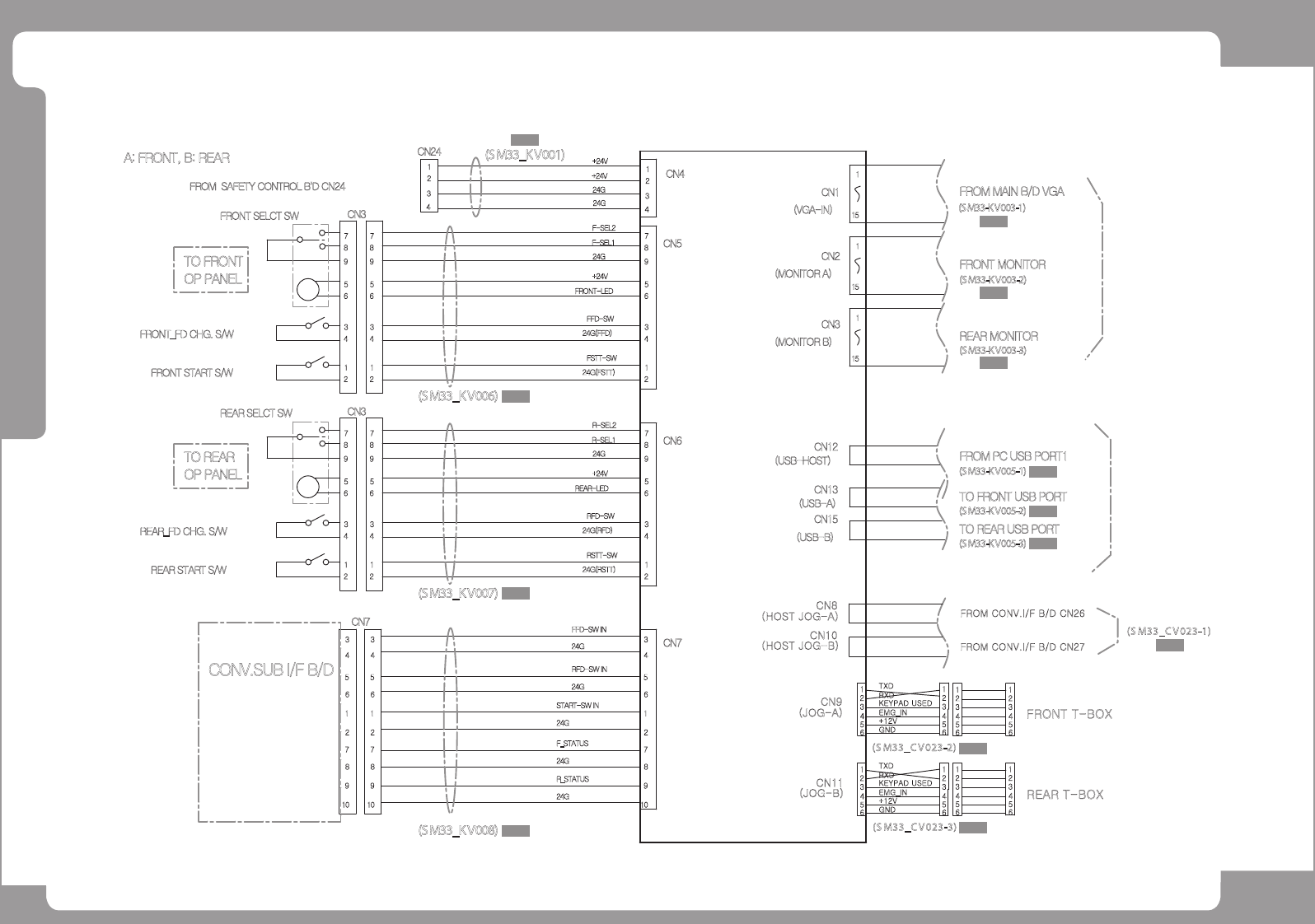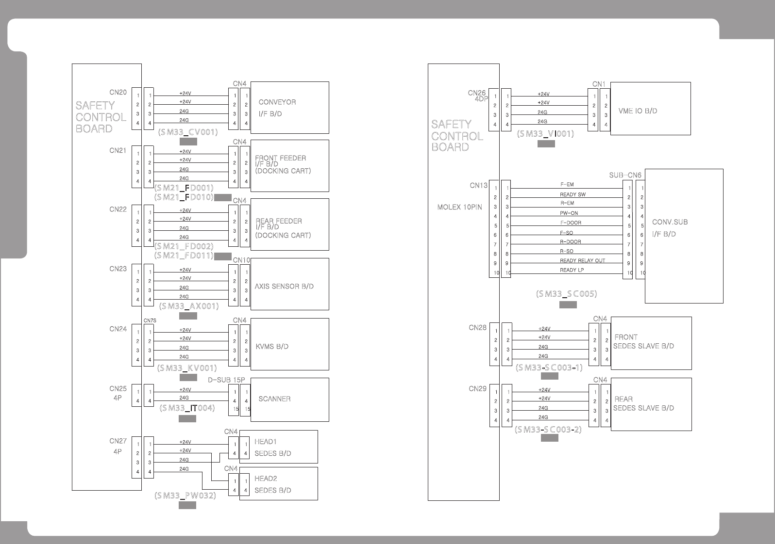 Page SAMSUNG TECHWIN 103 SM411 S af et y C on tro l Bo ard I nte rf ace ( 1/3 ) MOLEX CN2P CN2S +24V 24G 24G +24V 4 3 1 2 4 3 1 2 DC POWER SUPPLY#1 MOLEX +24V 24G 4 4 4 4 MOLEX 14PIN CN3 2 2 3 3 MC1 +24V 1 1 READY LP +24…