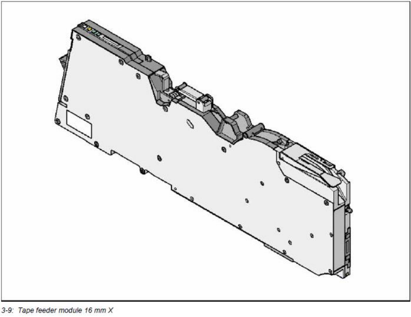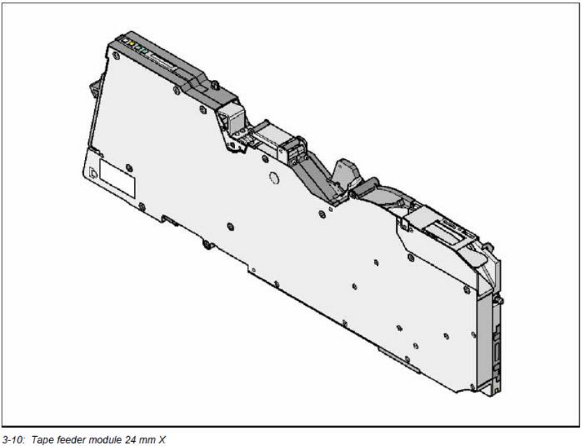 3.5.5 24 mm X 备件号 no.: 00141273 - xx 带接料检测感应器的备件号: 00141293 - xx 宽度 : 34.4 mm 台车上占用轨道 : 3 步进距离 : 4 - 32 mm 每次 4 mm 距离调整 换料时间 : < 45 s 整体飞达模块换料 : < 15 s