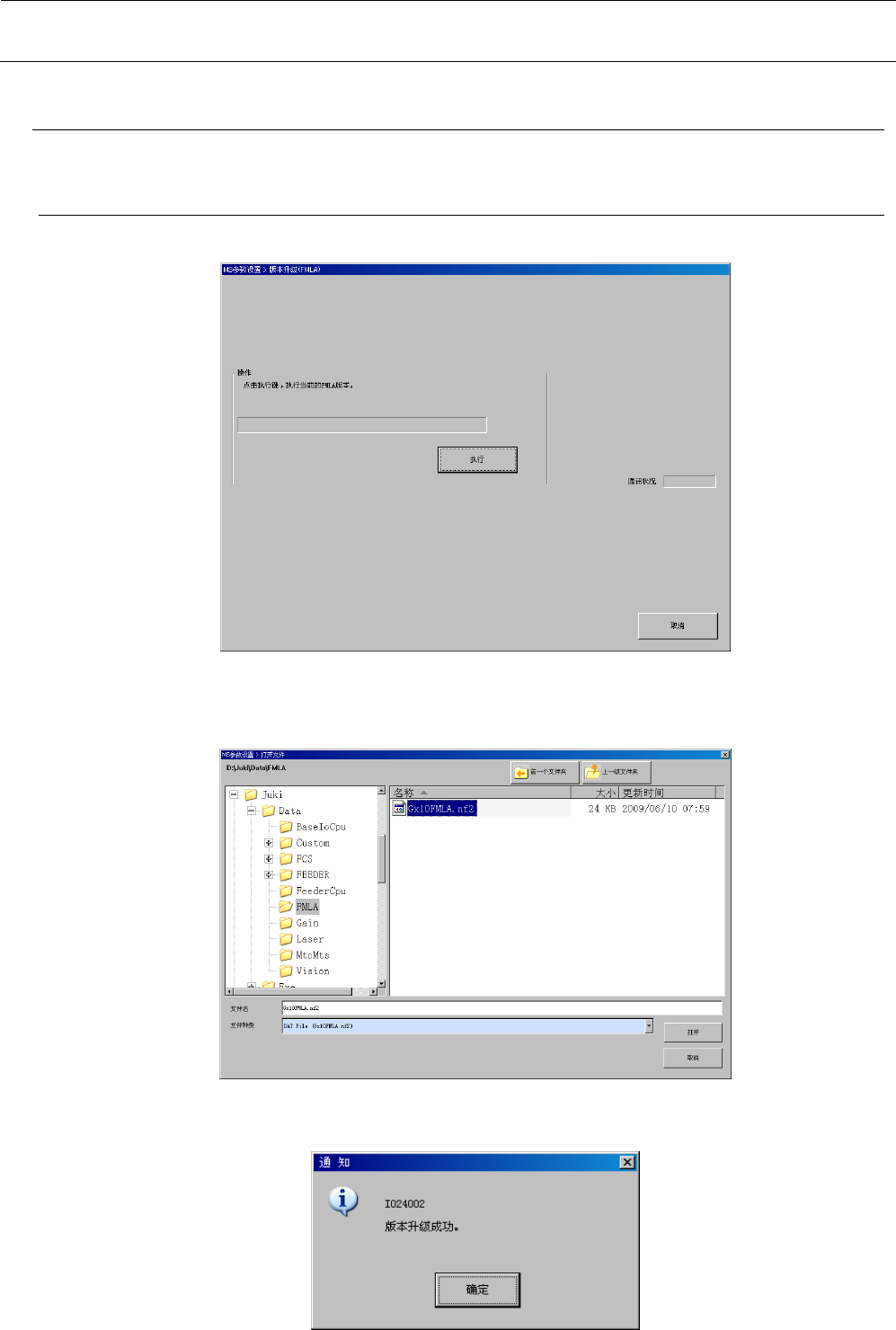 MS 参数 6-4 6-3 版本升级 - FML A 进行 FMLA 固件的版本升 级。 6-3- 1 操作 选择 “ 版本升级 ” - “ 版本升级 - FMLA” 后,会显示以 下的对话框。 按 “ 执行 ” 按钮,打 开用于进行版本升级的 对话框。 (默认位置 : D: \ JUKI \ D ATA \ Fm la )选 择 文 件( GX10Fmla.nf2 ),按 “ 打开 ” 按钮读入文件, 对所 有 FMLA 的固件进行版…