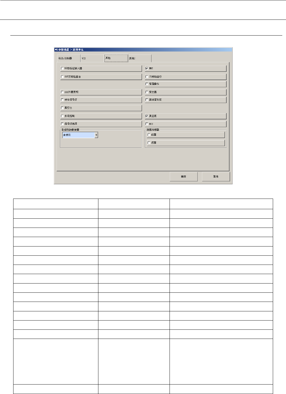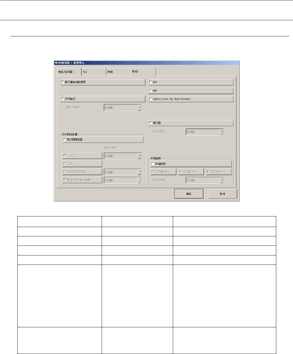MS 参数 3-7 3-2-3- 4 其他 2 在其他一项中可设置以 下的选配项 目。 在选择 com 端口时,请选 择与各选项装置对应的 COM 端口编号。 设置项目 可设置的参数 备注 离子静电消除装 置 有/无 EPV 有/无 元件验证 有/无 如果有,选择 com 端口 测力器 有/无 如果有,选择 com 端口 条形码阅读器 有/无 如果有, 一 次元/ 二 次元/ 多条形码 阅读器 / 背面多条形码 阅读器 有一 次元时,选…