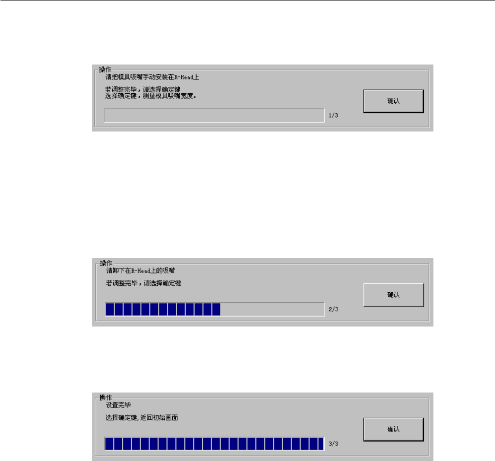 MS 参数 4- 12 <操作 ・ 1/3 > 请把模具吸嘴安装到设 定贴片头。 请输入模具吸嘴的宽度 ( 6mm ),点击确认 键。 点击确认键后,即通过 激光来测量 设置贴片头的模 具吸嘴。 测量将反复进行 10 次,取 平均值。 测量结束后, 显示吸嘴宽度 (测量值) , 根据 测量结果计算出激光 缩放比例并予以更 新。 <操作 ・ 2/3 > 请从设定贴片头取下模 具吸嘴。 准备完毕,请选择确定 键。 <操作 ・ 3/3 > 结…