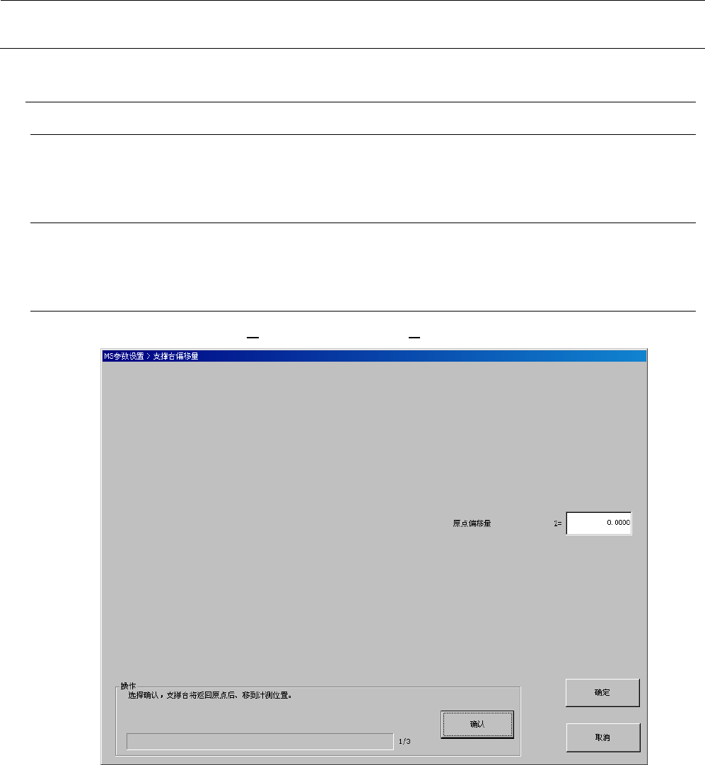 MS 参数 4- 23 <操作 ・ 1/3 > 请点击 “ 操作 ” 框内的 “ 确认 ” 按 钮。 “ 确认 ” 按钮被按下 后, 支撑台返回原点后将 向计测开始 位置移动。 <操作 ・ 2/3 > 请利用示教使支撑台上 升,对准传 送带与夹紧用构 件接触的位置。 示教完成后,请按 “ 确认 ” 按钮。 ( 4 根轨道导轴中 有一个首先到顶的高度 , 另外3根应在距 该高度 0.1 mm 以内到顶。如 果不是 0.1 mm 以内,请进…