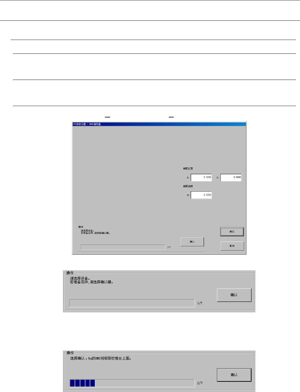 MS 参数 4- 35 <操作 ・ 3/7 > 将显示以下操作内容,故利用示教移动 Head ,使传感器光射到校准台的平 坦部分。此 时,请确认传感器 被启动(传感器 头的 LED 双方均亮 灯),按下 “ 确认 ” 按钮。 “ 确认 ” 按 钮被按下后,将通过传 感器测量装 配的虚拟高度。 (虚拟高度) <操作 ・ 5/7 > 虚拟高度的计测结束后 ,请按 “ 确认 ” 按钮。 “ 确认 ” 按钮被选择 后, HMS 向校准台第 1 …