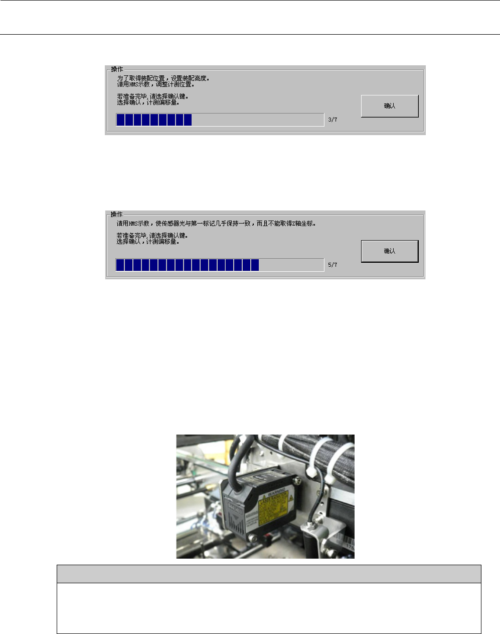 当出现以下对话框时,请利用HMS示教逐步移动Head,使传感器光与校准台的第1标