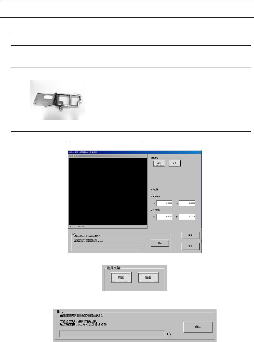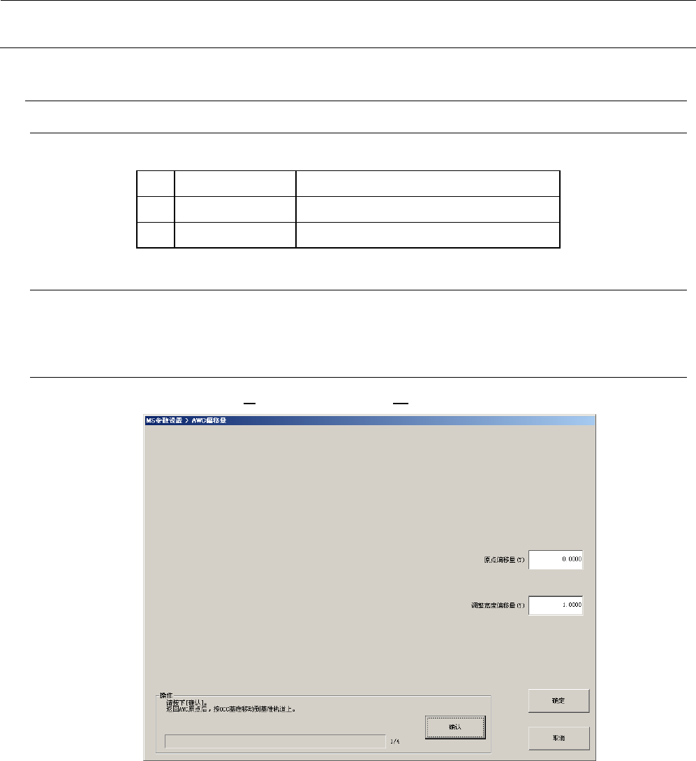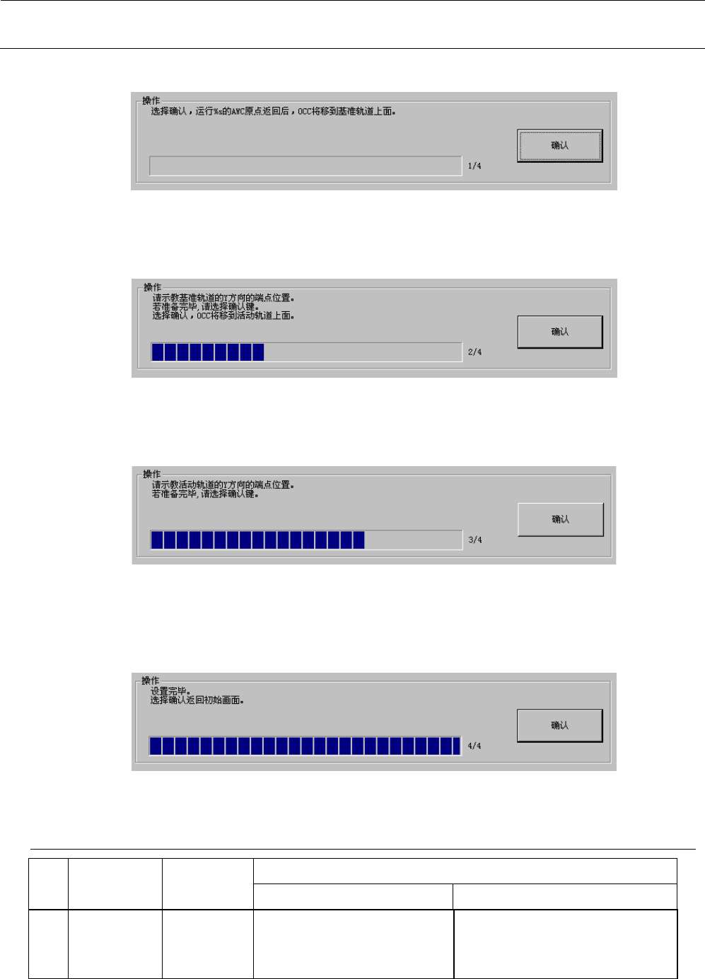 MS 参数 4- 41 <操作 ・ 1/4 > 请选择 “ 操作 ” 框内的 “ 确认 ” 按钮。 “ 确认 ” 按钮被按下 ,则 AW C 原点 返回完成后 OCC 将移动到基准轨道上。 <操作 ・ 2/4 > 请利用示教决定基准轨 道内侧的 Y 坐标。 示教结束后,请按下 “ 确认 ” 按钮。如按下 “ 确认 ” 按钮, OCC 将移动到活动轨道上。 <操作 ・ 3/4 > 与基准轨道相同,请利 用示教决定 活动轨道内侧的 Y 坐标…