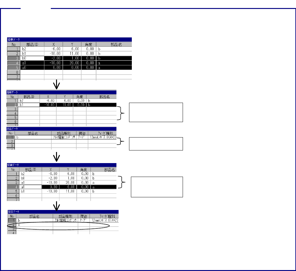 4 - 18 4-3-1-2. [ いいえ いいえ いいえ いいえ ] を選択した場合 を選択した場合 を選択した場合 を選択した場合 搭載データおよび部品データが削除されます。このとき、搭載データは記憶バッ ファに取り込まれ 貼り付け可能ですが、部品データは貼り付けできませんので十分注意してください。 部品 a が搭載 a1 と a2 に、部品 b が搭載 b1 、 b2 、 b3 に関連付けられているケースを例に解説します。 注…