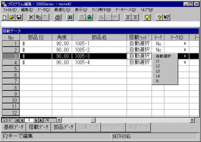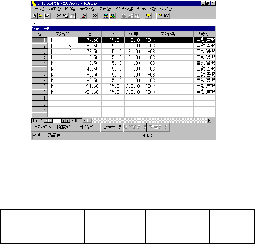 4 - 49 ③ 角度 角度 角度 角度 搭載角度を数式バーで入力します。 設定範囲は 0 ° ∼ 359.95 ° です。設定は 0.05 ° 単位でできます。 ④ 部品名 部品名 部品名 部品名 部品名を数式バーで入力します。 本部品名を入力する度に部 品データの枠がとられます 。間 違って入力した場合に,部品デー タに何らかの入力をしてい ない限り名前を変更すると 間違 って入力した部品データの枠は解 放されます。また部品名を…