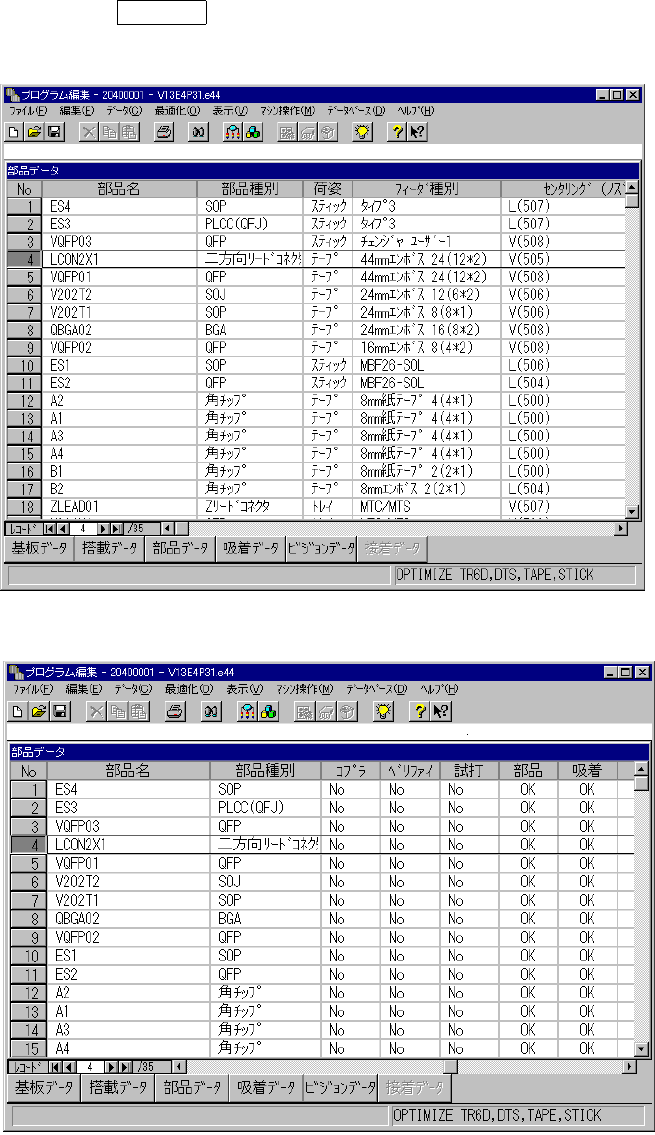 4 - 56 4-7. 部品データ 部品データ 部品データ 部品データ 4-7-1. 基本操作法 基本操作法 基本操作法 基本操作法 部品データの入力画面は、フォーム表示① と リスト表示形式② の 2 通りがあります。 ① ① ① ①フォーム表示画面 フォーム表示画面 フォーム表示画面 フォーム表示画面 フォーム表示画 面は、 1 つの部品デー タを 1 画面に表示し ます。デ ータの入力は、フ ォーム表 示画面で行います。