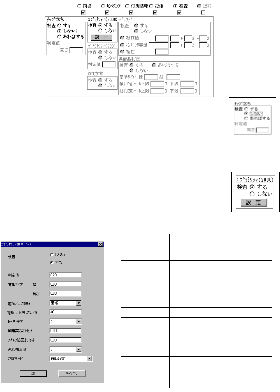 4 - 84 検 査 コプラナリティ 検査をするかしないかを選択しま す。 判定値 判定値を設定します。 幅 電 極 サイズ の幅を設定します。 電 極 サイズ 長さ 電 極 サイズ の長さを設定します。 電極 光沢情報 電極 光沢情報を設定します。 通常 光沢あり 光沢なし 電極 明るさしきい値 電極 明るさのしきい値を設定します。 レーザ強 度 レーザ の強度を 設定します。 測定高さ オフ…