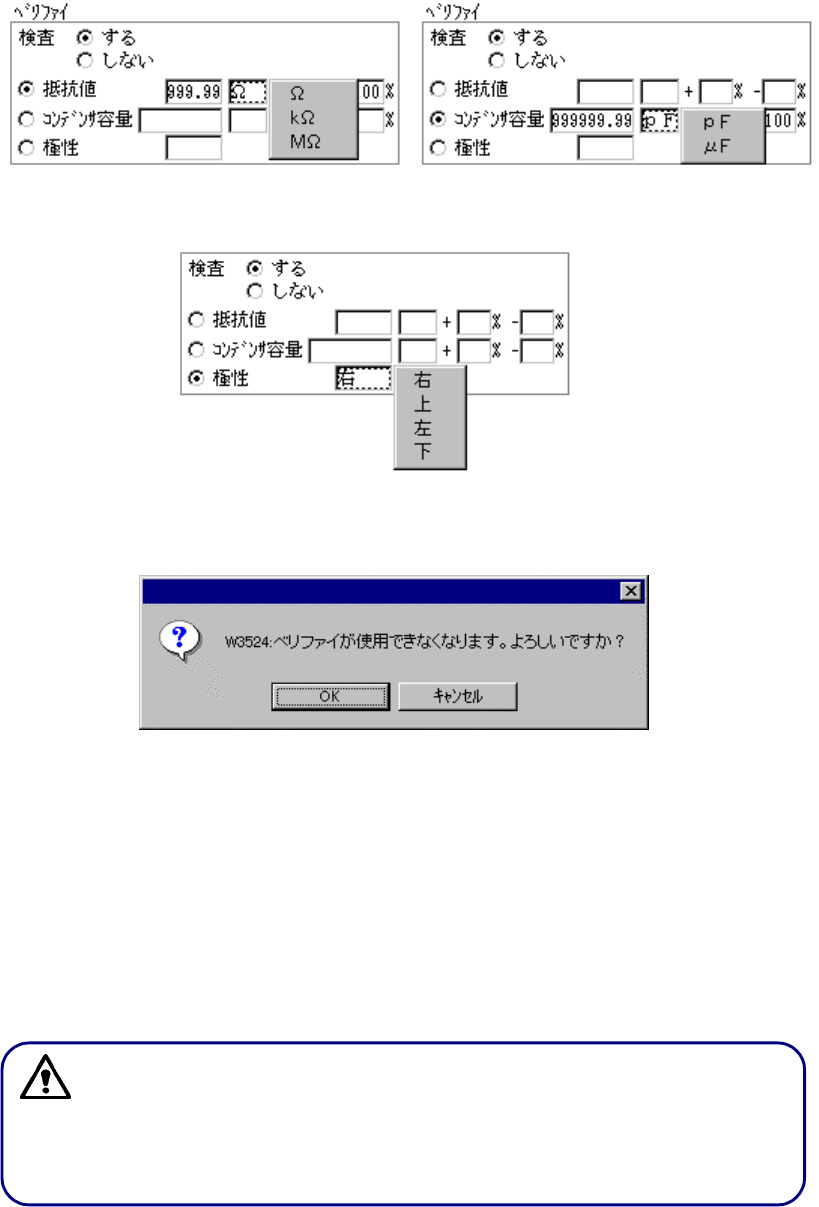 「抵抗値」または「コンデンサ容量」を指定した場合は、判定値・単位・許容誤差の上限/