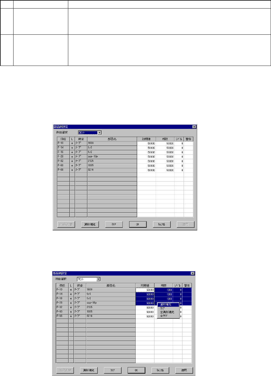 6 - 19 供給選択: 表示の切 り替えは, 供給選択 のコンボボッ クスによりフ ロント, リアの表示選択が できま す。 NO 項目 内容 1 フロント フロント側にセットされた部品のみを表示しています。 2 リア リア側にセットされた部品のみを表示しています。 3 ホルダ ホルダにセットされた部品を表示します。 4 DTS DTSにセットされた部品を表示します。 5 MTC MTCにセットされた部品を表示します。 6 MTS…