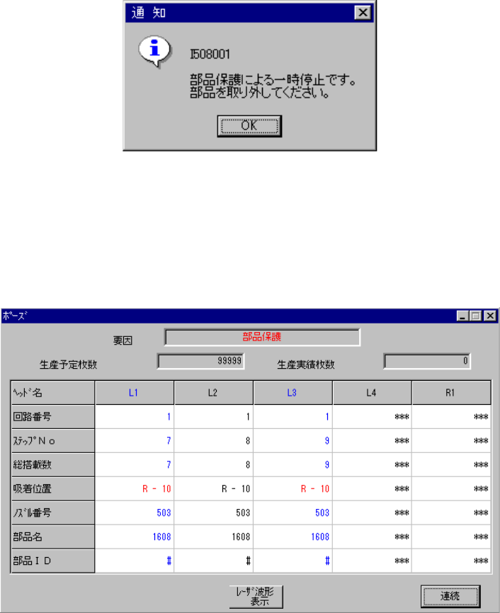 6 - 61 6-4-7. 部品保護による一時停止 部品保護による一時停止 部品保護による一時停止 部品保護による一時停止 生産プログラムの部品 データ (拡張設定 ) で, 部品保護指定さ れている部品 で認識異常が発生し た場合は,一時停止して図 6-4-7-1 を表示します。 図 図 図 図 6-4- 7-1 部品保護一時停止ダイアログ 部品保護一時停止ダイアログ 部品保護一時停止ダイアログ 部品保護一時停止ダイアログ ◇ こ…