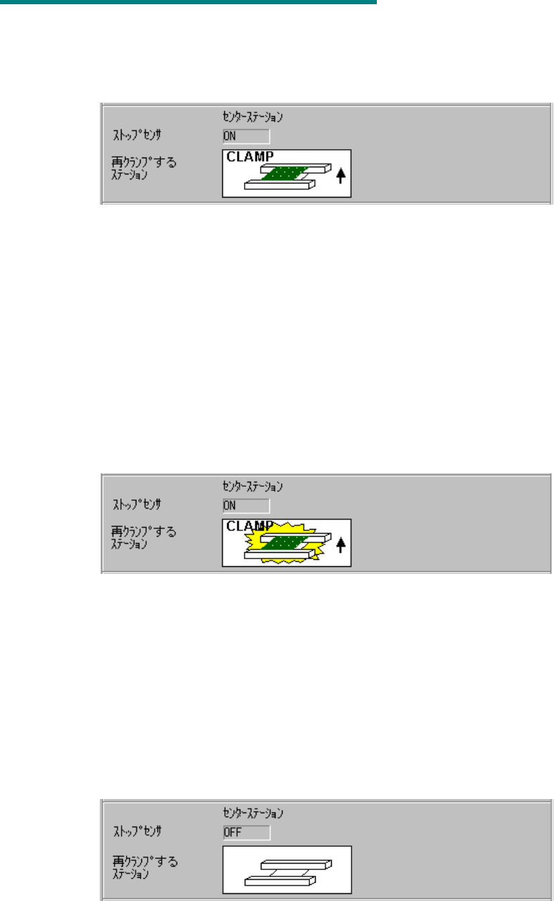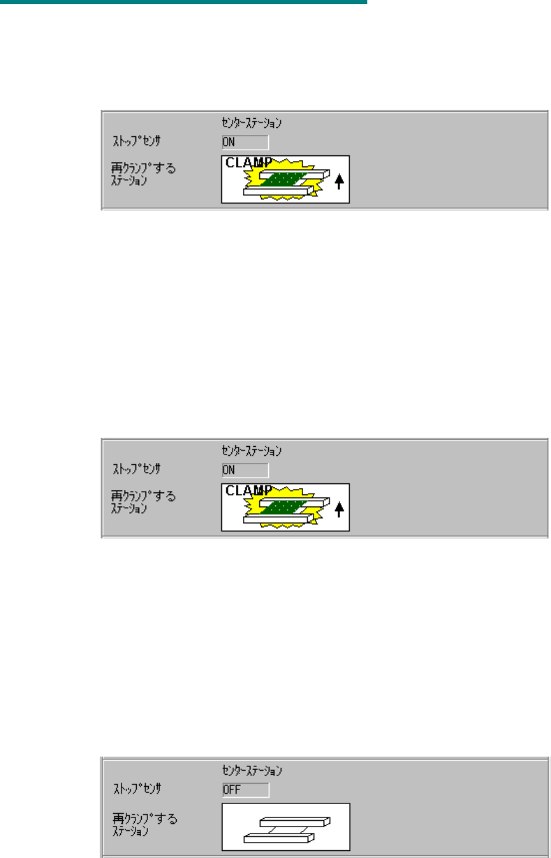 「継続生産を行う」「再クランプ後生産」を選択すると、搬送路上の状態の表示は以下の