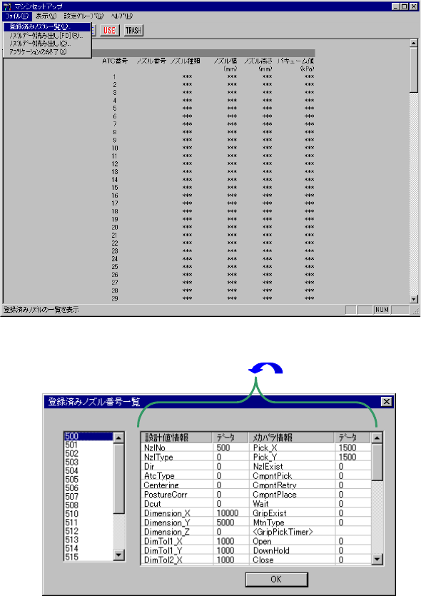7 - 5 7-2. メニュー メニュー メニュー メニュー 7-2-1. ファイル ファイル ファイル ファイル 基本的な操作は、「 3-6 ファイル操作」「 4-2 ファイル」を参照して下さい。 7-2-1-1. 登録済みノズル一覧 登録済みノズル一覧 登録済みノズル一覧 登録済みノズル一覧 メニューバーの[ファイル]から[登録済みノズル一覧]を選択すると登録済みノズル番号一覧ダ イアログ(図 7-2-1-1-2 )を表示します。 …
