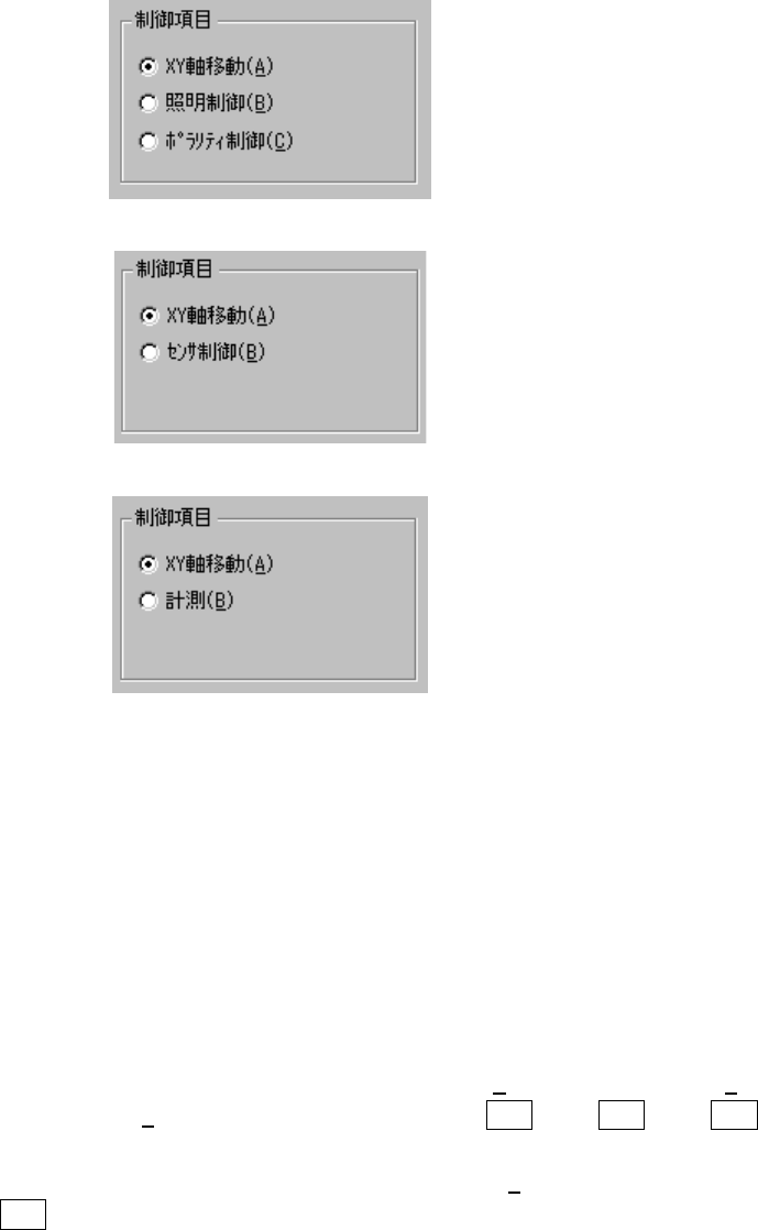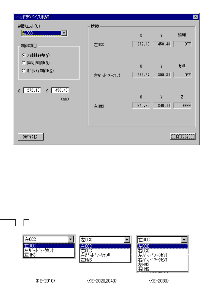 8 - 12 (2) 制御項目 制御項目をラジオボタンにより選択します。 制御項目選択のラジオボタンは制御ユニットにより異なります。 ① OCC ② バッドマークセンサ ③ HMS (3) 制御ボタン 制御ボタンにより制御項目を実行します。 制御ボタンの表示は、制御項目により異なります。 ① 制御ユニットで OCC を選択したときの制御方法 1) XY 軸移動 ヘッド制御の XY 軸移動と同様です。 2) 照明制御 OCC の照明の…