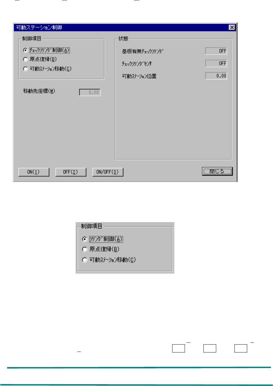 8 – 32 8-3-4. 可動ステーション制御 可動ステーション制御 可動ステーション制御 可動ステーション制御( ( ( ( KE-2030 対応) 対応) 対応) 対応) [制御( C )][搬送系( C )][可動 ステーション制御 ( M ) ... ]を選択すると,下記の可動 ステーション制御 のダイアログが表示されます。 図 図 図 図 8-3-4 可動ステーション制御ダイアログ 可動ステーション制御ダイアログ 可動ス…