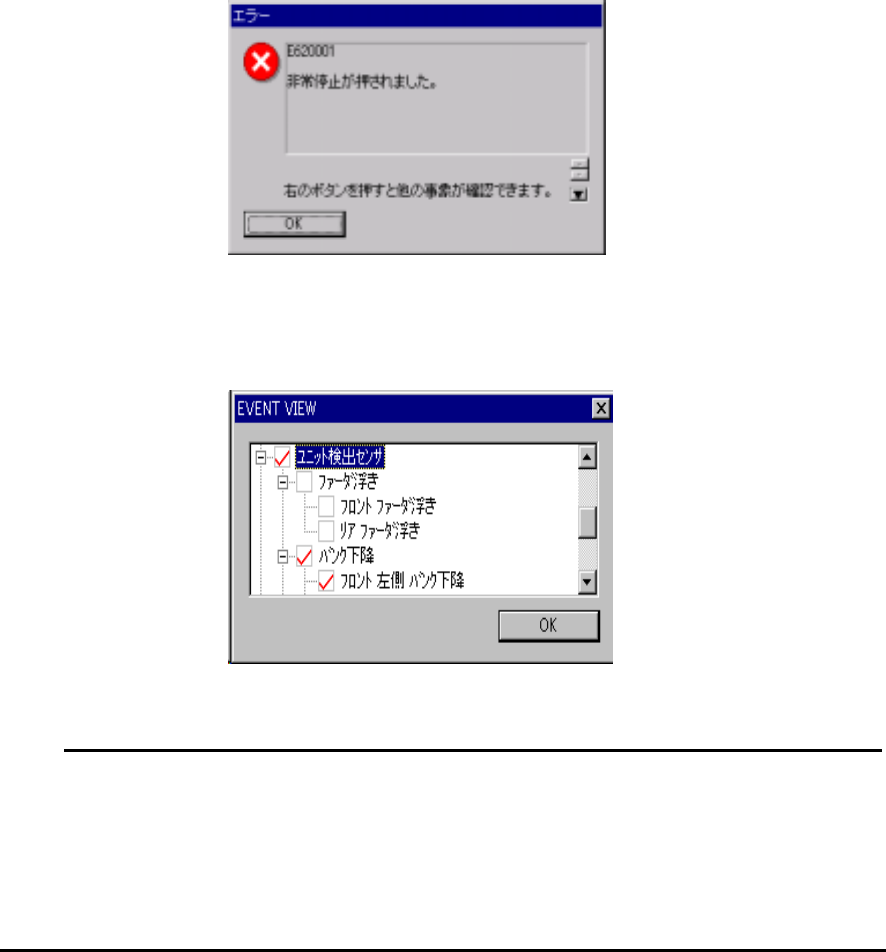 9 - 25 9-5-2. 事象画面のボタン 事象画面のボタン 事象画面のボタン 事象画面のボタン 安全カバーを開けた場合、非常停止ボタンを押した場合、また各軸のサーボドラ イバーのアラーム を検出した場合等に以下の画面が表示されます。 ◇ 画面中の 「右のボタンを押 すと他の事象が 確認できま す」 と表示される場合があ ります。 これは 同時に複数の事象が発 生し、優先度 が高い事象し か画面表示出 来なか った 時 に、 表示…