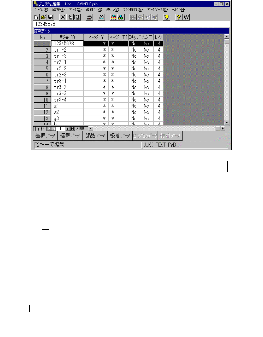 4 - 45 4-6. 搭載データ 搭載データ 搭載データ 搭載データ 4-6-1. 基本操作法 基本操作法 基本操作法 基本操作法 起動画面 起動画面 起動画面 起動画面 搭載データの入力画面が立ち上がると下図の様なリスト画面が表示されます。 入力フォーカスのある行は,リバース表示されますが,入力フォーカスのあるセ ルは,リバースさ れていません。 入力する文字は,数式バーの部分にエコーバック表示され,確定するとセル内に反映されま…