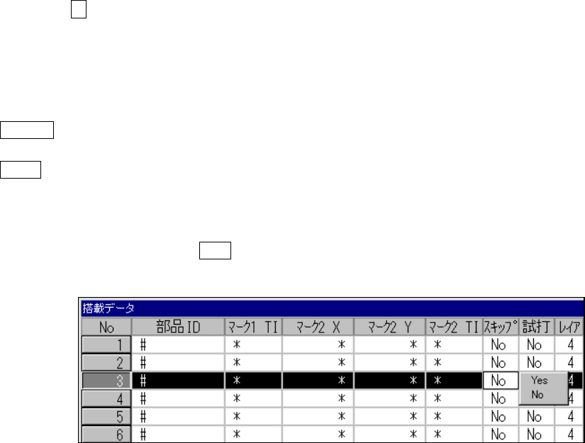 4 - 48 4-6-2. 入力方法 入力方法 入力方法 入力方法 搭載データ画面 搭載データ画面 搭載データ画面 搭載データ画面 詳細 詳細 詳細 詳細 ① 部品 部品 部品 部品 ID 部品 ID を数式バーで入力します。本項を入 力するとデフォルト値が入 る項目にはデフォル ト値が適用され表示されます。入力の不必要な項目は, * が表示されます。 デフォルト値 デフォルト値 デフォルト値 デフォルト値 搭載ヘッ ド …