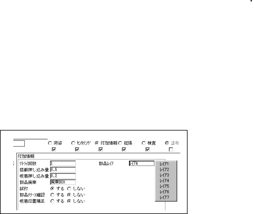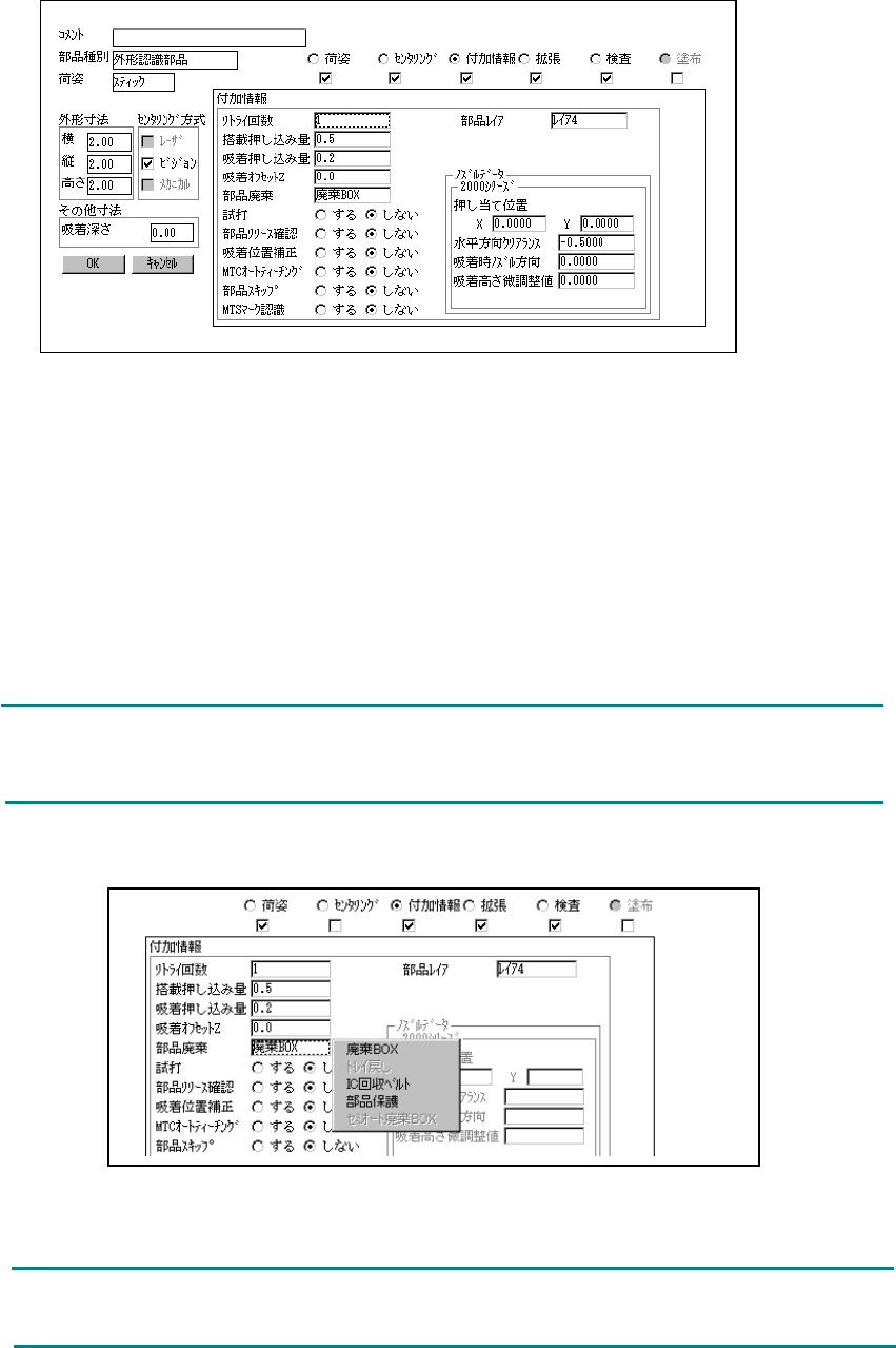 4 - 79 4-7-5. タック タック タック タックコントロール部(付加情報ページ) コントロール部(付加情報ページ) コントロール部(付加情報ページ) コントロール部(付加情報ページ) 付加情報に割り当てられている項目は、デ フォルト値が常に適用され るので、通常変更する 必 要は有りません。デフォルトの値を変更し たい場合だけ、付加情報ウ インドウをオープンし て 下さい。一度、付加情報項目を変更後に、 部品種別、センタリ…
