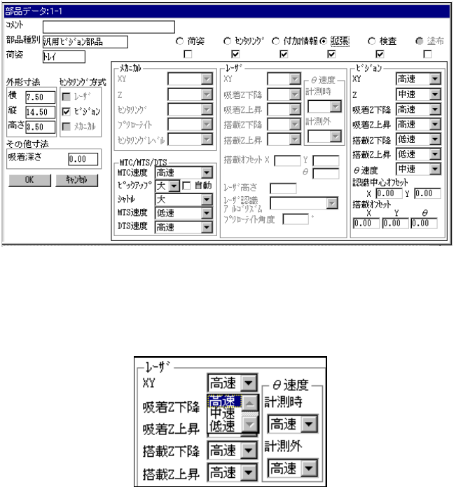 4 - 81 4-7-6. タックコントロール部(拡張ページ) タックコントロール部(拡張ページ) タックコントロール部(拡張ページ) タックコントロール部(拡張ページ) 拡張に割り当てられている項目は、デフォ ルト値が常に適用されるの で、通常変更する必要 は 有りません。デフォルトの値を変更したい 場合だけ、拡張ウインドウ をオープンして下さい 。 一度拡張項目を変更後に、部品種別、セン タリング、部品荷姿の項目 を変更すると値…