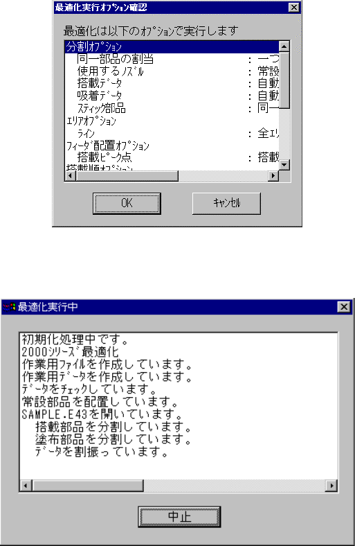 4 - 132 (1) 実行 実行 実行 実行 最適化ダイアログ中の実行ボタンを選択することにより,最適化処理が開始されます。 最適化の各オプションの設定状況を表示するダイアログが表示されます。 図 図 図 図 4-10-1-3 最適化実行オプション確認ダイアログ 最適化実行オプション確認ダイアログ 最適化実行オプション確認ダイアログ 最適化実行オプション確認ダイアログ( ( ( (プログラム編集と生産計画) プログラム編集と生…