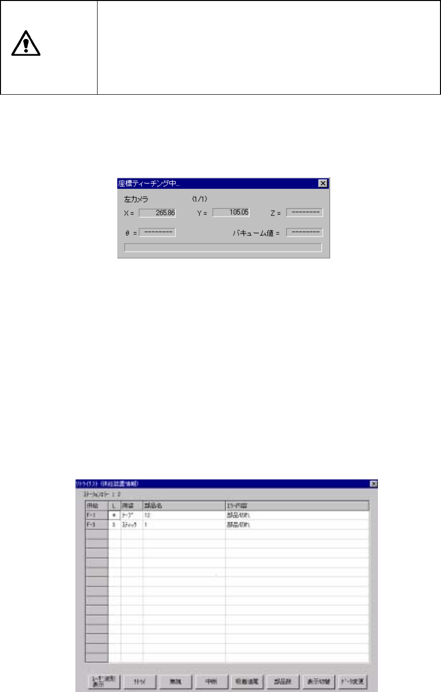 6 - 49 注意 フィーダバンク認識を 一度も行って いない場合に (原点復帰から, もしくは バ ンクが下降し上昇させた後 から) ,吸着位置移動前にフ ィーダバンク認識を自 動的に行う場合があります。 フィーダバンク認識実 行時は, ヘッドが供給装置の上 を横切りますので, 手や 顔などを装置内に入れ たり近づけな いで下さい。 特にティーチング, 吸着追尾 などのメニュー以外からの認識実行時の動作には気をつけて下さい。 …