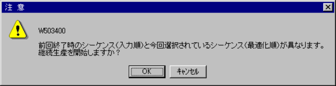 6 - 69 ⑤ 継続生産開始時の問い合わせダイアログ 基板生産条件ダイアロ グのシーケン ス (入力順が最適化順を選 択) を変更して継続生産を 実行 すると下図の注意が表示されます。 図 図 図 図 6-4- 10-6 継続生産開始時の問い合わせダイアログ 継続生産開始時の問い合わせダイアログ 継続生産開始時の問い合わせ…