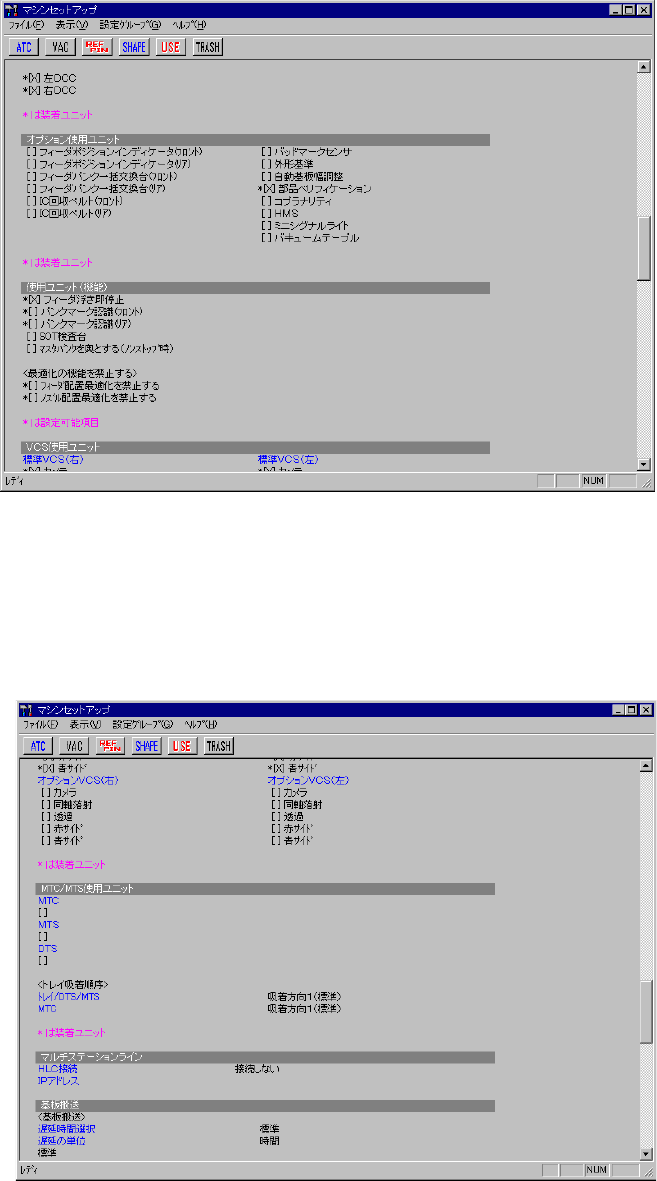 7 - 3 「オプション使用ユニット」、「使用ユニット(機能)」、「 「オプション使用ユニット」、「使用ユニット(機能)」、「 「オプション使用ユニット」、「使用ユニット(機能)」、「 「オプション使用ユニット」、「使用ユニット(機能)」、「 VCS 使用ユニット」の現在設定状況 使用ユニット」の現在設定状況 使用ユニット」の現在設定状況 使用ユニット」の現在設定状況 図 図 図 図 7-1-1-3 マシンセットアップ初期画面3 マシン…
