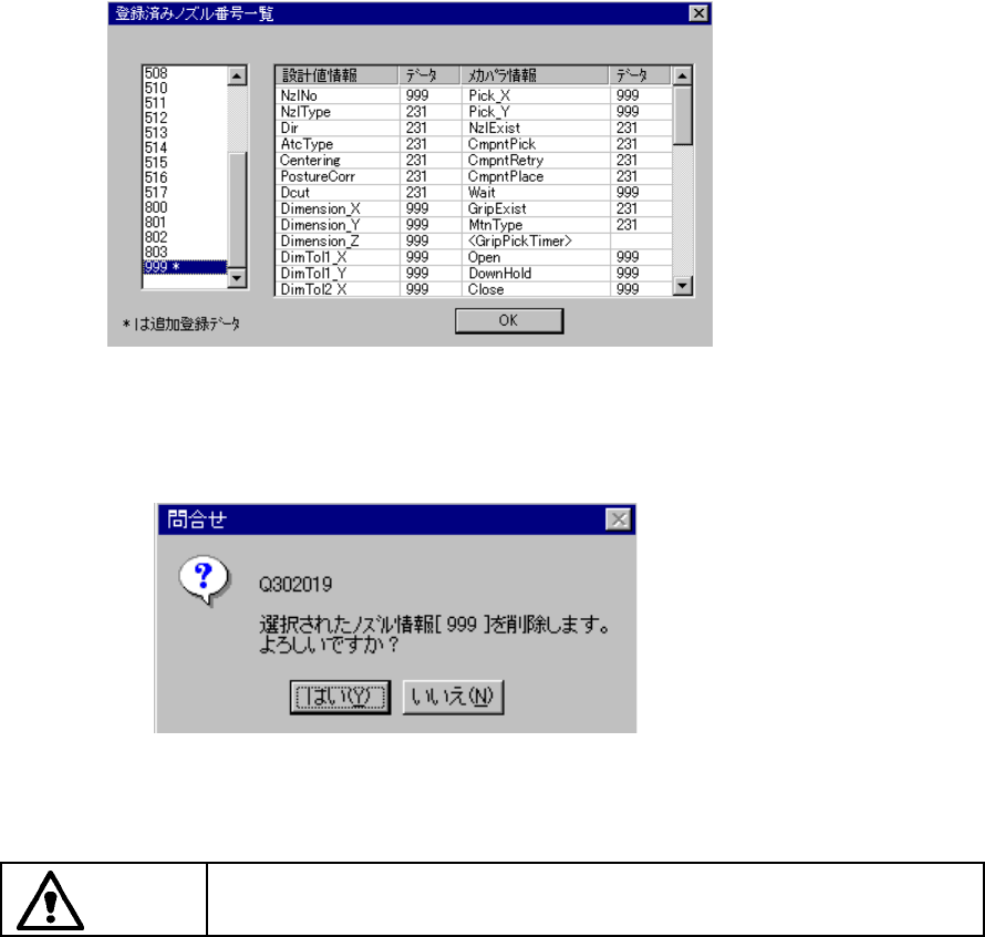 問合わせに「はい」と答えるとそのノズルが[登録済みノズル番号一覧]から削除されます。