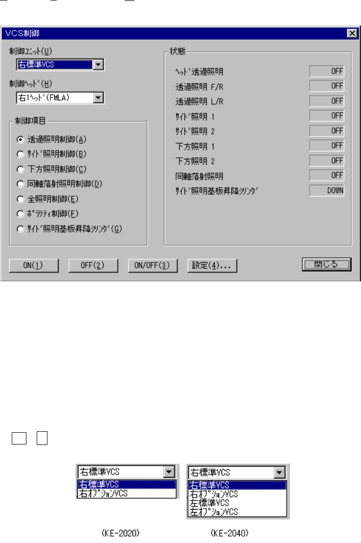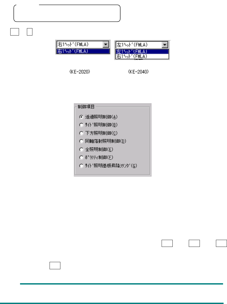 8 – 37 (2) 制御ヘッド 制御対象ヘッドをコンボボックスにより選択します。 マシンセットアップの“使用ユニット”での設定には影響しません。 (チェックされていない(使用しない)ユニットも選択可能) FMLA ヘッドのみ選択できます。 ◆ A lt + ↓ キーで、下記の一覧表が表示されます。 (3) 制御項目 制御項目をラジオボタンにより選択します。 (4) 制御ボタン 制御ボタンにより制御項目を実行します。 制御ボ…